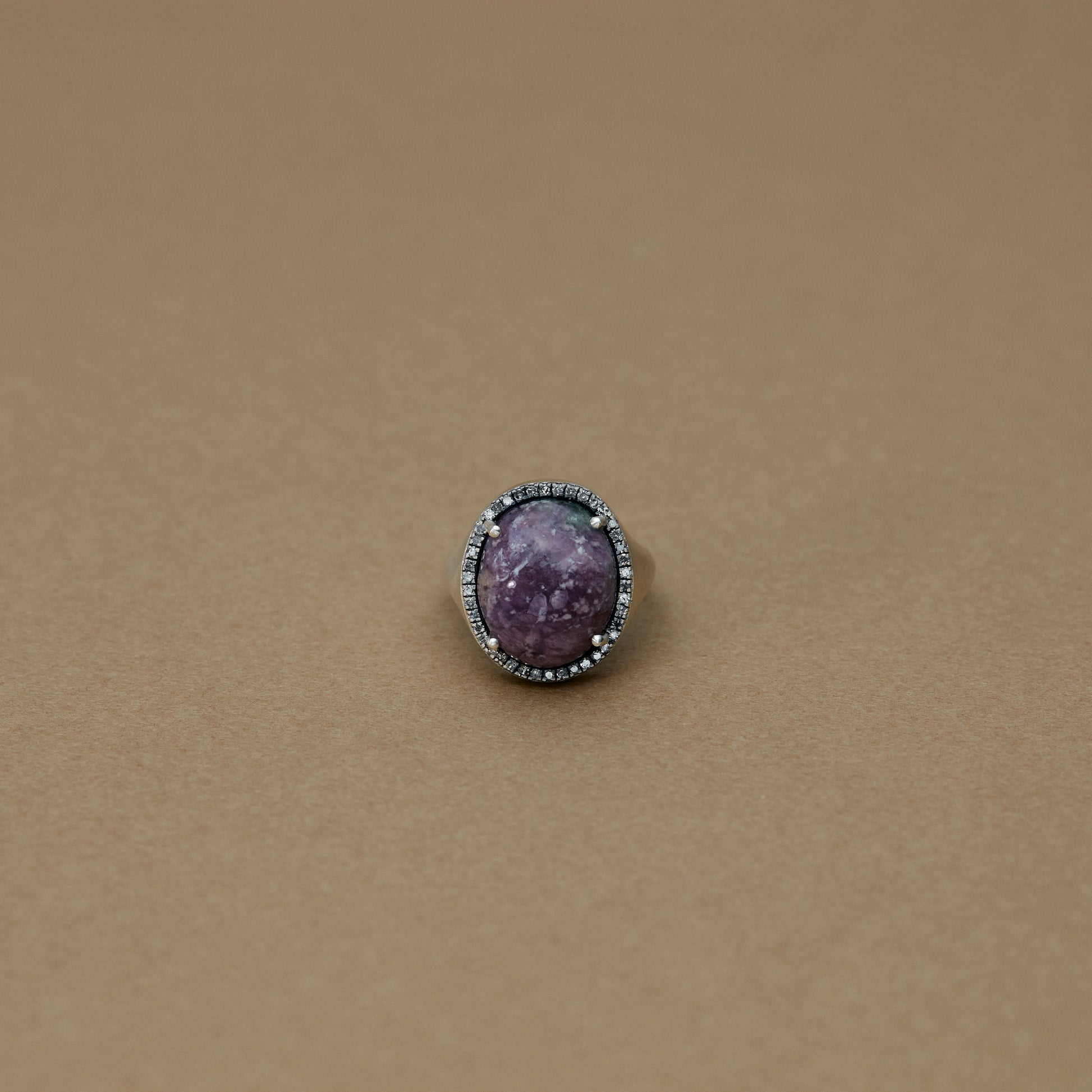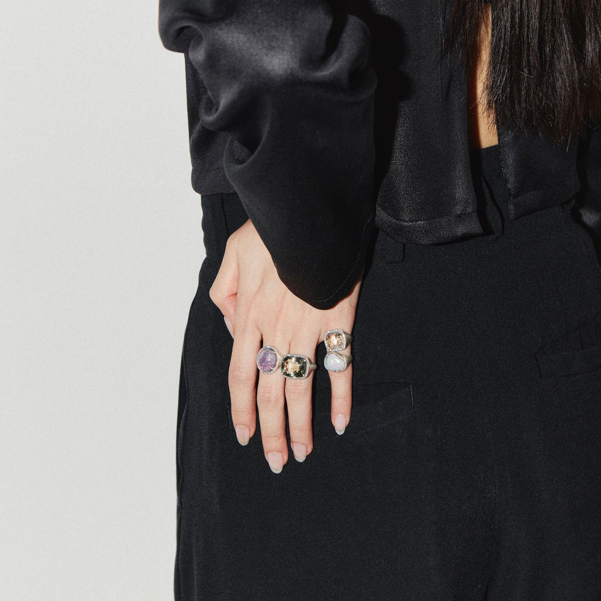 長年眠っていたデッドストックのストーンを、日本国内の職人の手によりモダンなカットに擦り上げました。パヴェダイヤモンドで取り巻き、爪部分にオキシダイズド加工をほどこすことでヴィンテージピースのような風合いに。丸みを帯びたボリュームシェイプのリングに成形しました。地金はリサイクルされたSilver925を使用、マットフィニッシュに柔らかな光沢を残しました。一点ものとなります。