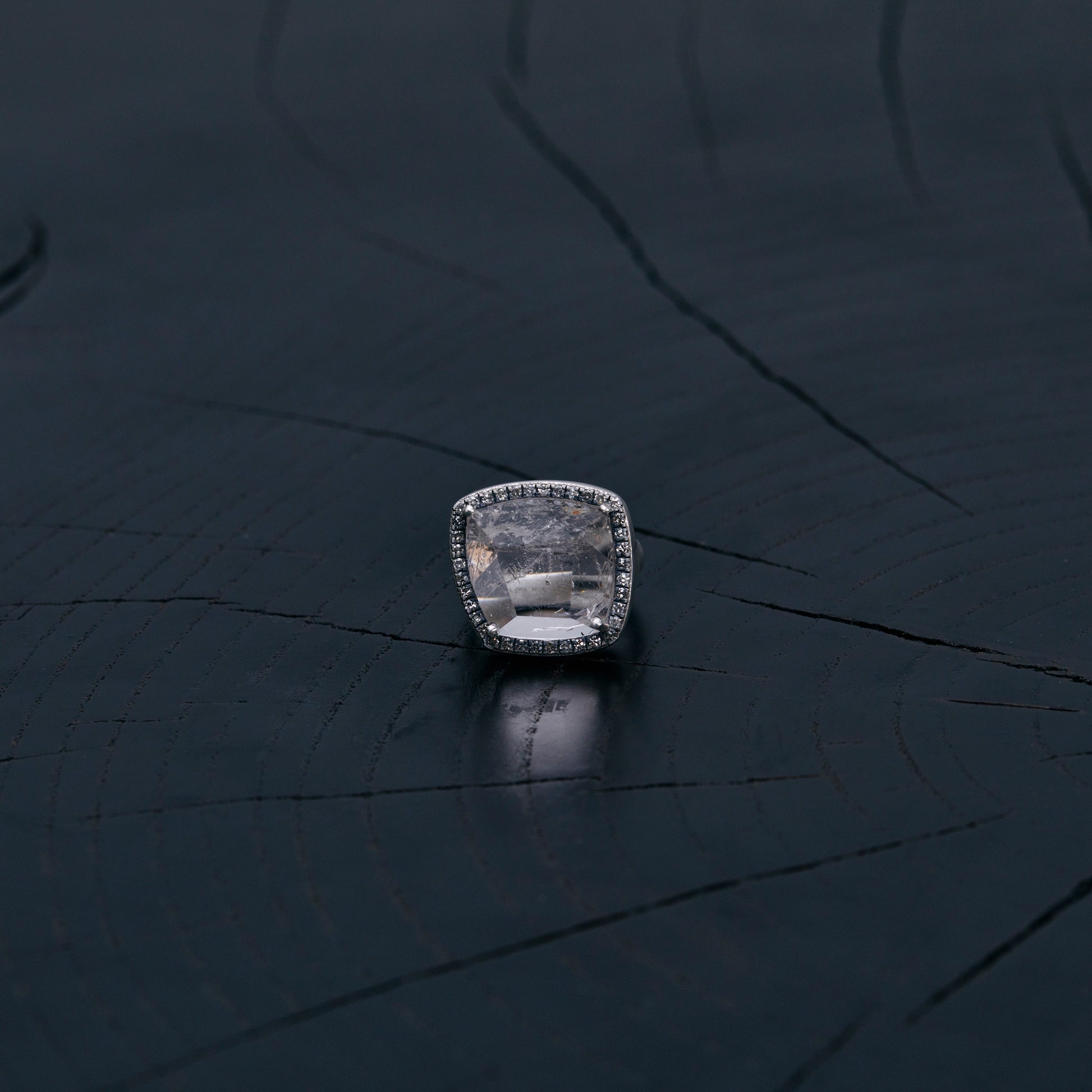 長年眠っていたデッドストックのストーンを、日本国内の職人の手によりモダンなカットに擦り上げました。パヴェダイヤモンドで取り巻き、爪部分にオキシダイズド加工をほどこすことでヴィンテージピースのような風合いに。丸みを帯びたボリュームシェイプのピンキーリングに成形しました。地金はリサイクルされたSilver925を使用、マットフィニッシュに柔らかな光沢を残しました。一点ものとなります。