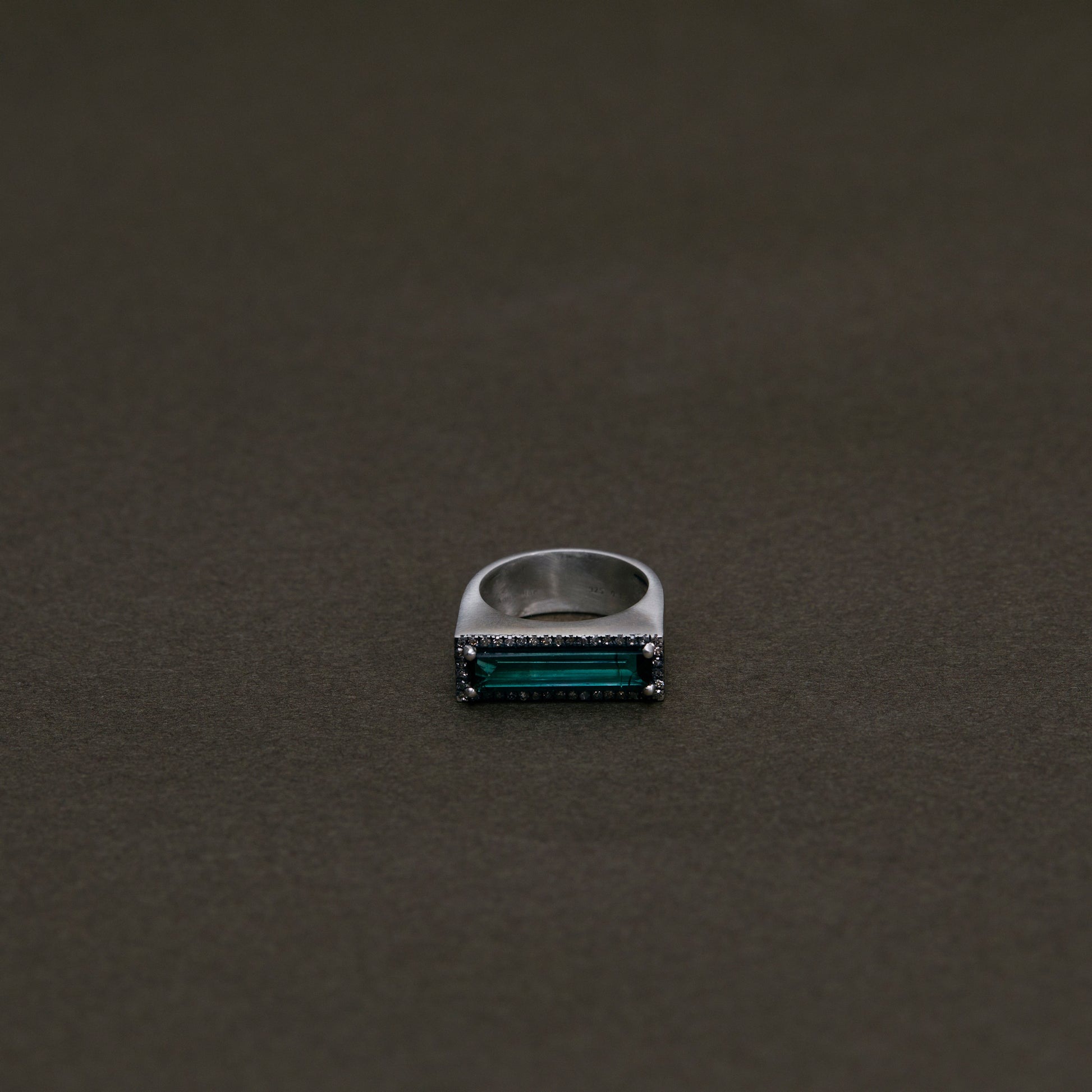 長年眠っていたデッドストックのストーンを、日本国内の職人の手によりモダンなカットに擦り上げました。パヴェダイヤモンドで取り巻き、爪部分にオキシダイズド加工をほどこすことでヴィンテージピースのような風合いに。ボリュームのあるワイドバンドリングに成形しました。地金はリサイクルされたSilver925を使用、マットフィニッシュに柔らかな光沢を残しました。一点ものとなります。