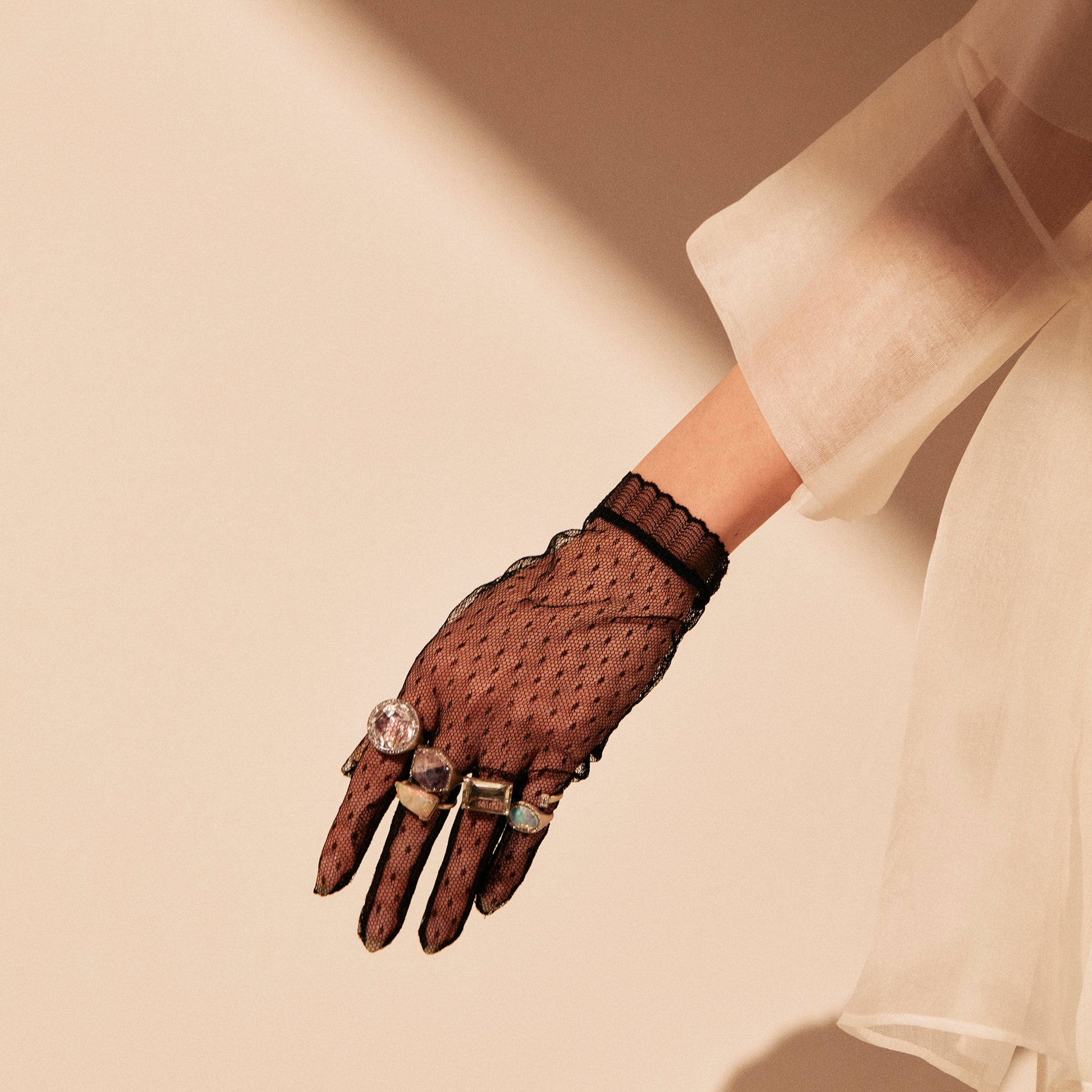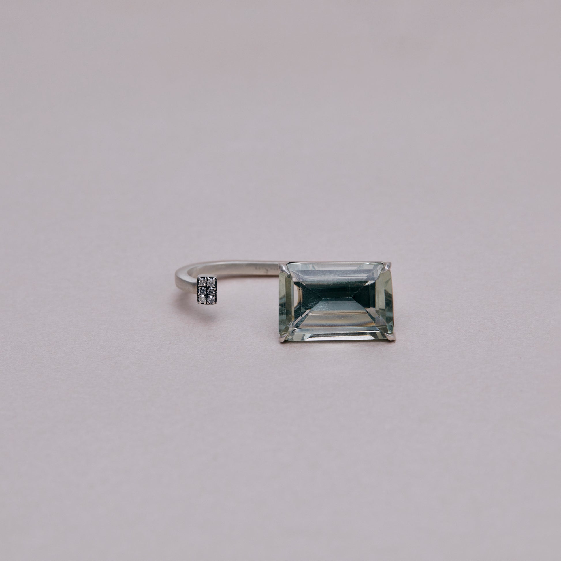 長年眠っていたデッドストックのストーンを、日本国内の職人の手によりモダンなカットに擦り上げました。爪留めした石の対極にパヴェダイヤモンドのパーツを配し、モダンな角線で繋いだダブルリング。地金はリサイクルされたSilver925を使用、マットフィニッシュに柔らかな光沢を残しました。一点ものとなります。