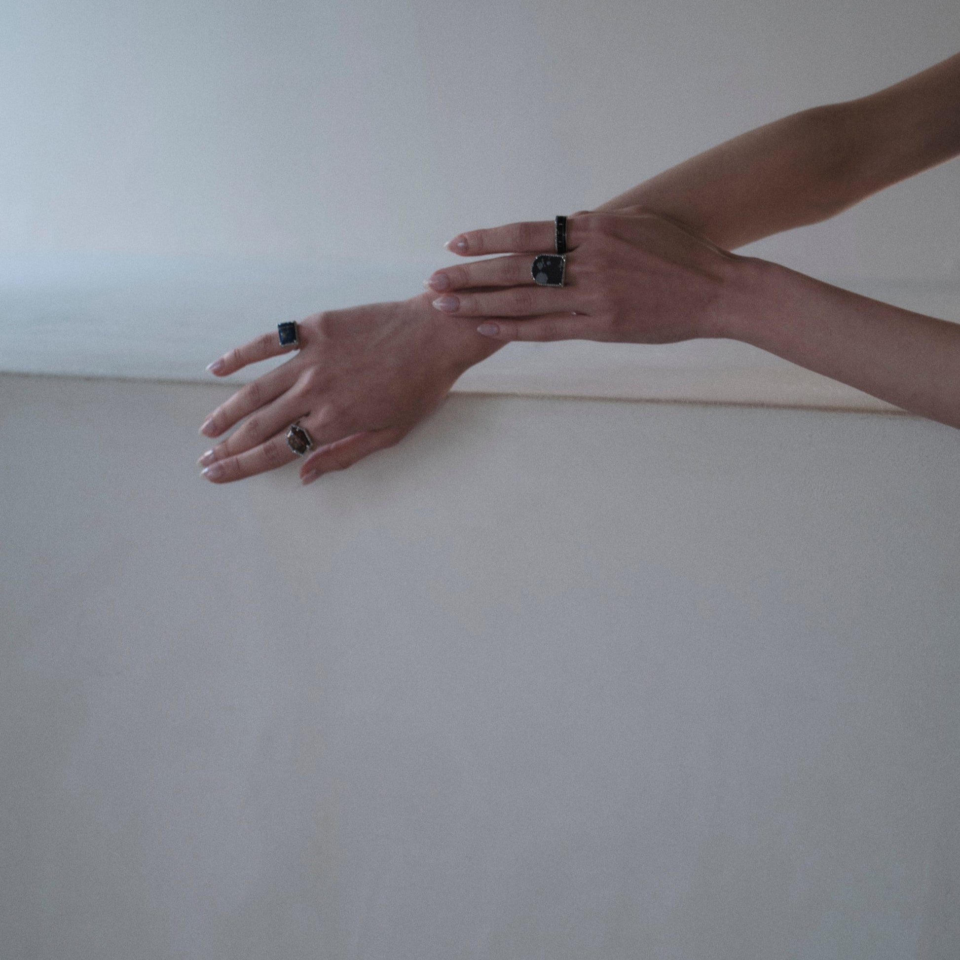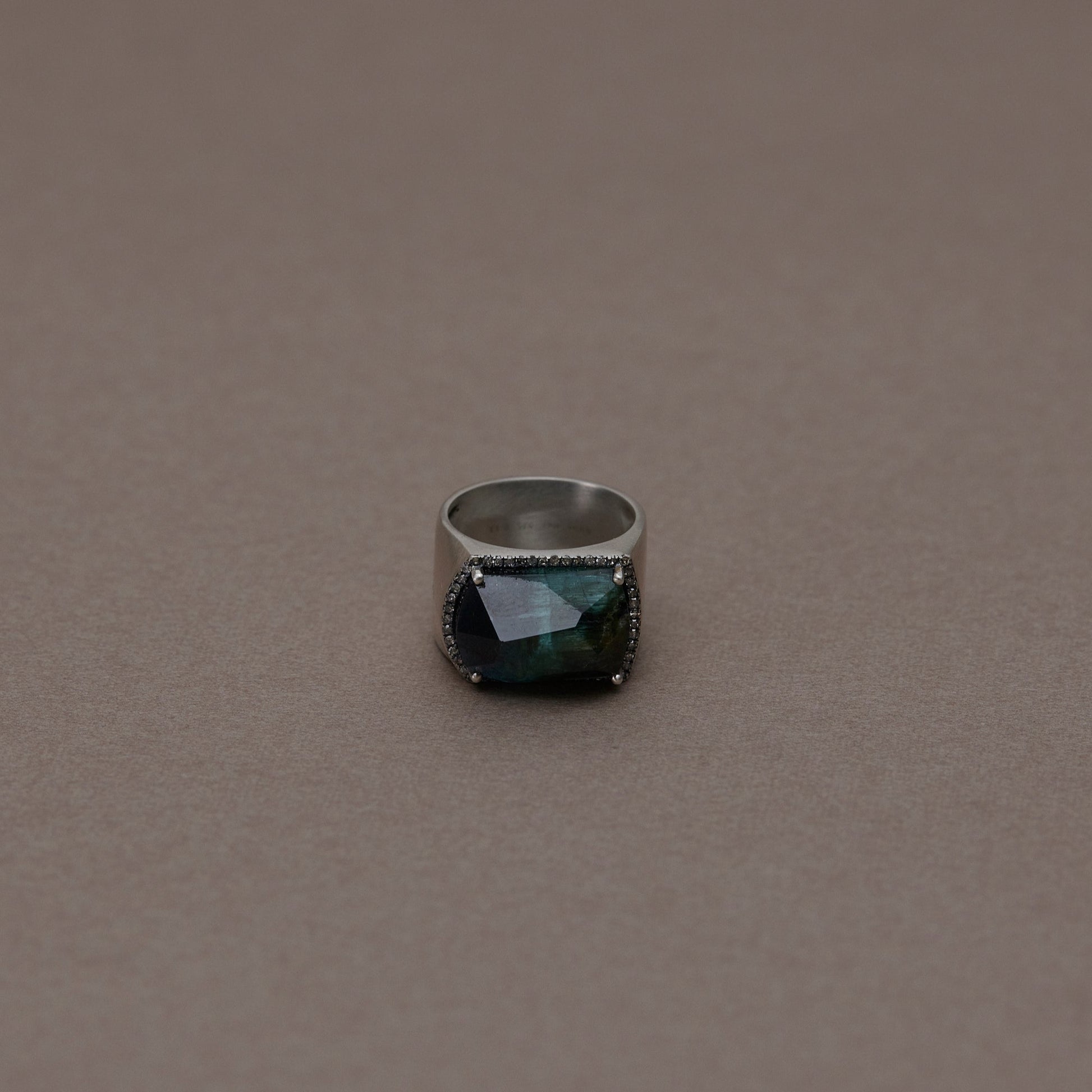 長年眠っていたデッドストックのストーンを、日本国内の職人の手によりモダンなカットに擦り上げました。パヴェダイヤモンドで取り巻き、爪部分にオキシダイズド加工をほどこすことでヴィンテージピースのような風合いに。ボリュームのあるワイドバンドリングに成形しました。地金はリサイクルされたSilver925を使用、マットフィニッシュに柔らかな光沢を残しました。一点ものとなります。