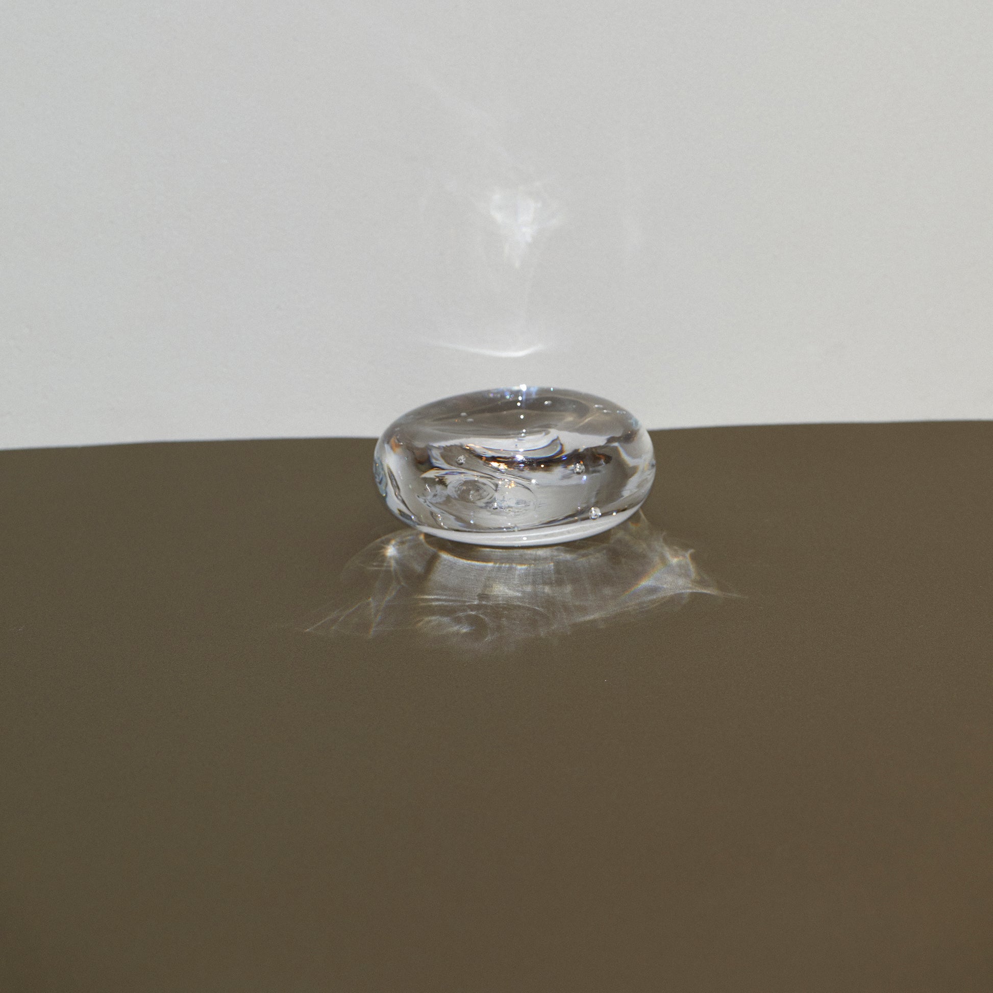 一点一点手作業で成形する、温かみを感じさせるフォルムに、大粒の気泡を含ませました。そのまま飾ってインテリアとして、ジュエリーや小物を乗せるトレイとしても。中心を窪ませることで、物を安定して乗せられる仕様になっています。