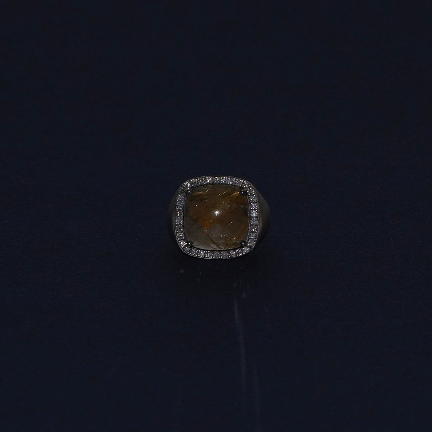 長年眠っていたデッドストックのストーンを、日本国内の職人の手によりモダンなカットに擦り上げました。パヴェダイヤモンドで取り巻き、爪部分にオキシダイズド加工をほどこすことでヴィンテージピースのような風合いに。丸みを帯びたボリュームシェイプのリングに成形しました。地金はリサイクルされたSilver925を使用、マットフィニッシュに柔らかな光沢を残しました。