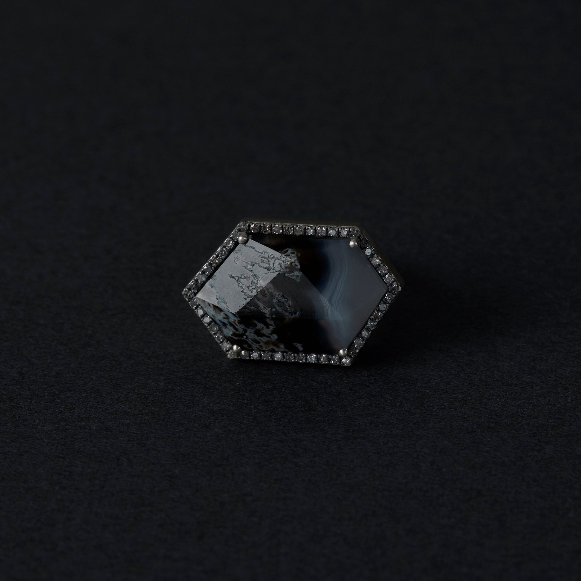 長年眠っていたデッドストックのストーンを、日本国内の職人の手によりモダンなカットに擦り上げました。パヴェダイヤモンドで取り巻き、爪部分にオキシダイズド加工をほどこすことでヴィンテージピースのような風合いに。丸みを帯びたボリュームシェイプのリングに成形しました。地金はリサイクルされたSilver925を使用、マットフィニッシュに柔らかな光沢を残しました。一点ものとなります。