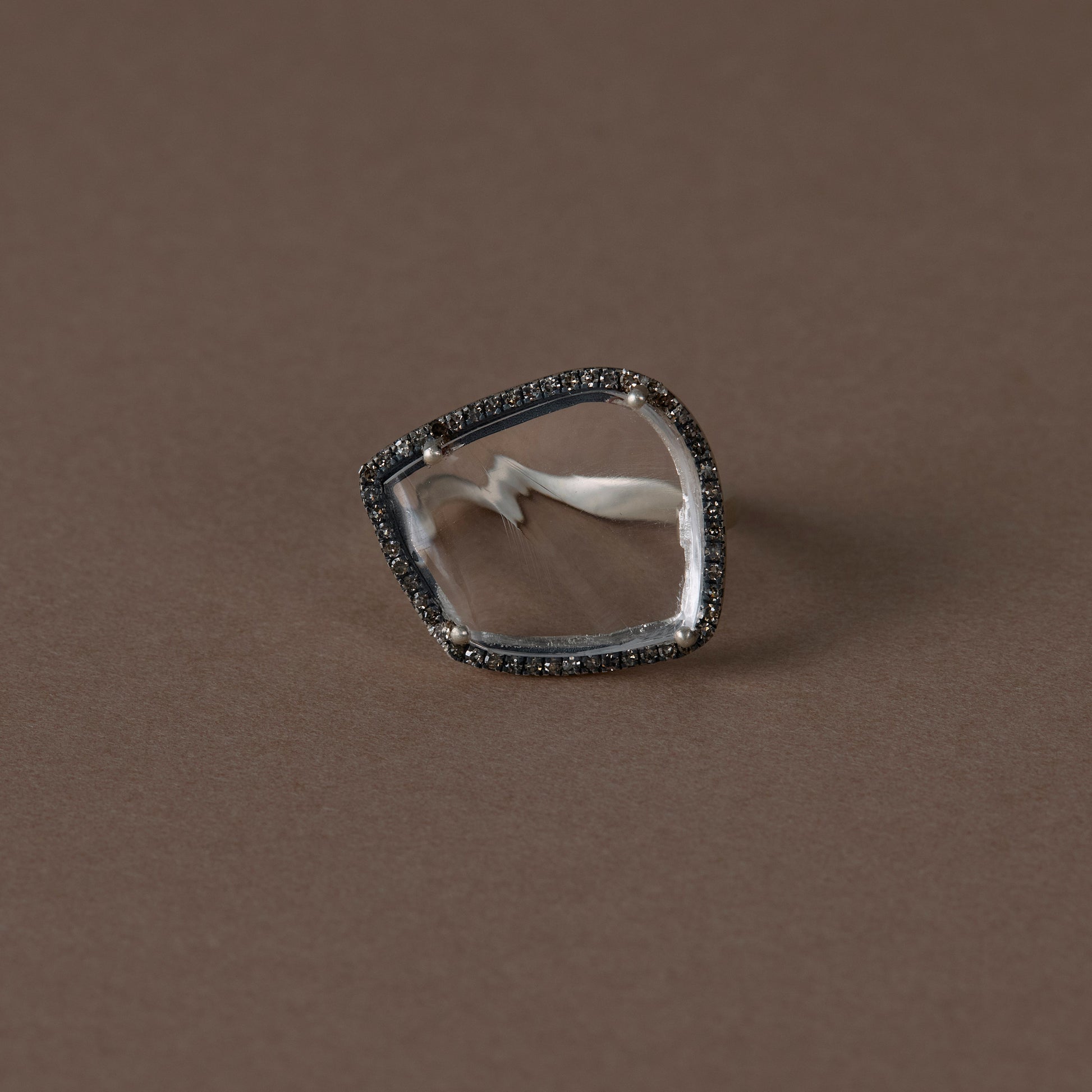 長年眠っていたデッドストックのストーンを、日本国内の職人の手によりモダンなカットに擦り上げました。パヴェのブラウンダイヤモンドで取り巻き、爪部分にオキシダイズド加工をほどこすことでヴィンテージピースのような風合いに。シャープな角線のリングに成形しました。地金はリサイクルされたSilver925を使用、マットフィニッシュに柔らかな光沢を残しました。一点ものとなります。
