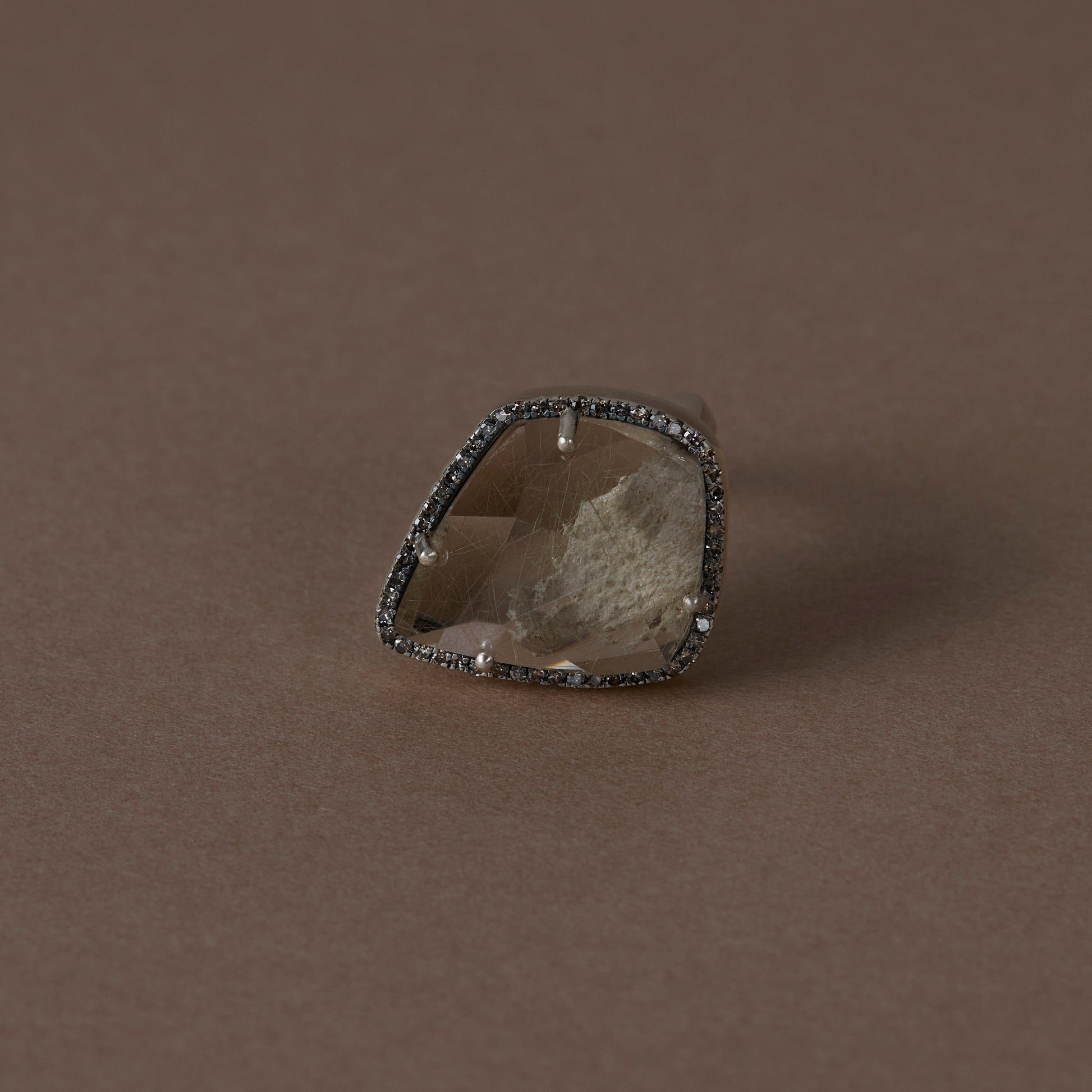 長年眠っていたデッドストックのストーンを、日本国内の職人の手によりモダンなカットに擦り上げました。パヴェのブラウンダイヤモンドで取り巻き、爪部分にオキシダイズド加工をほどこすことでヴィンテージピースのような風合いに。シャープな角線のリングに成形しました。地金はリサイクルされたSilver925を使用、マットフィニッシュに柔らかな光沢を残しました。一点ものとなります。