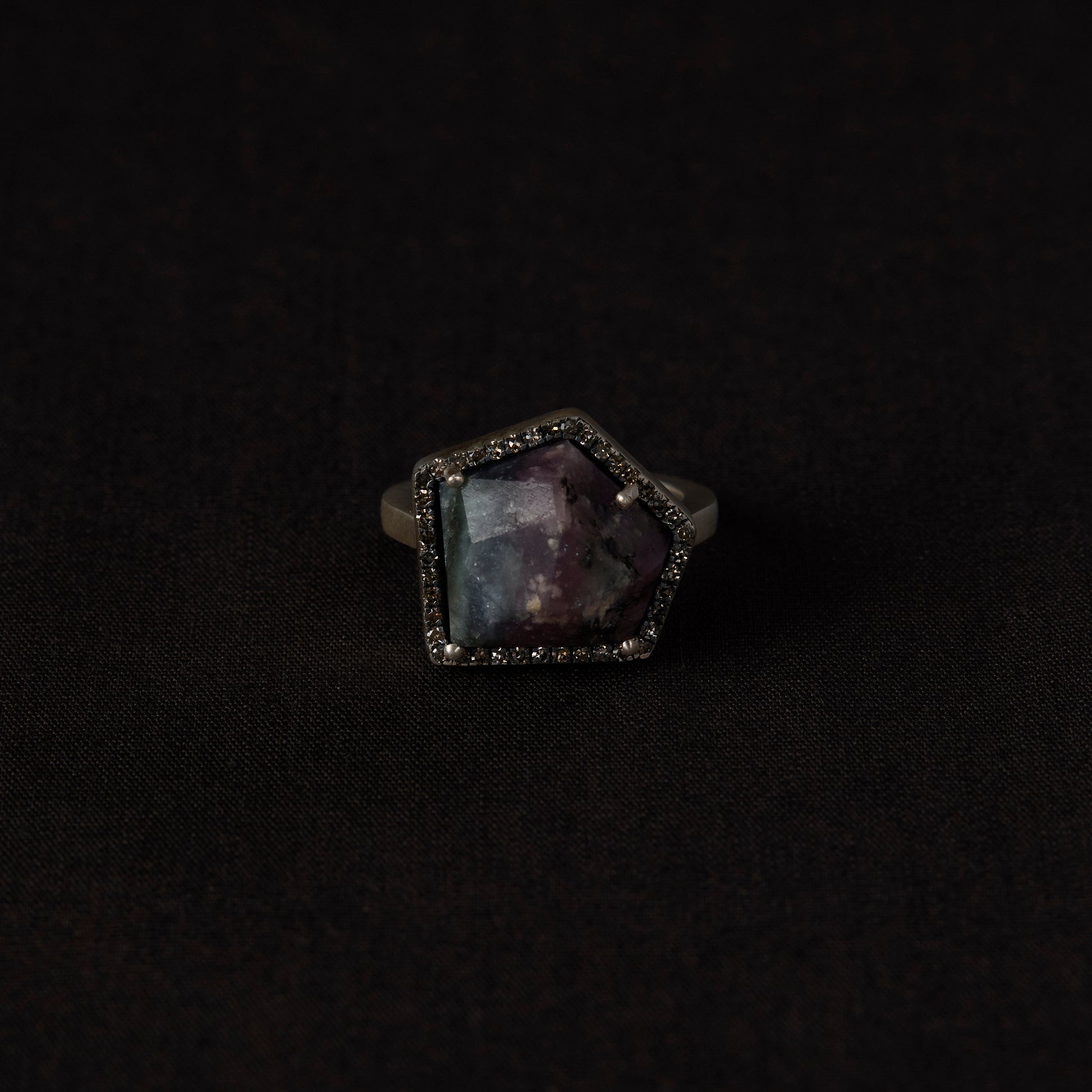 長年眠っていたデッドストックのストーンを、日本国内の職人の手によりモダンなカットに擦り上げました。パヴェのブラウンダイヤモンドで取り巻き、爪部分にオキシダイズド加工をほどこすことでヴィンテージピースのような風合いに。シャープな角線のリングに成形しました。地金はリサイクルされたSilver925を使用、マットフィニッシュに柔らかな光沢を残しました。一点ものとなります。