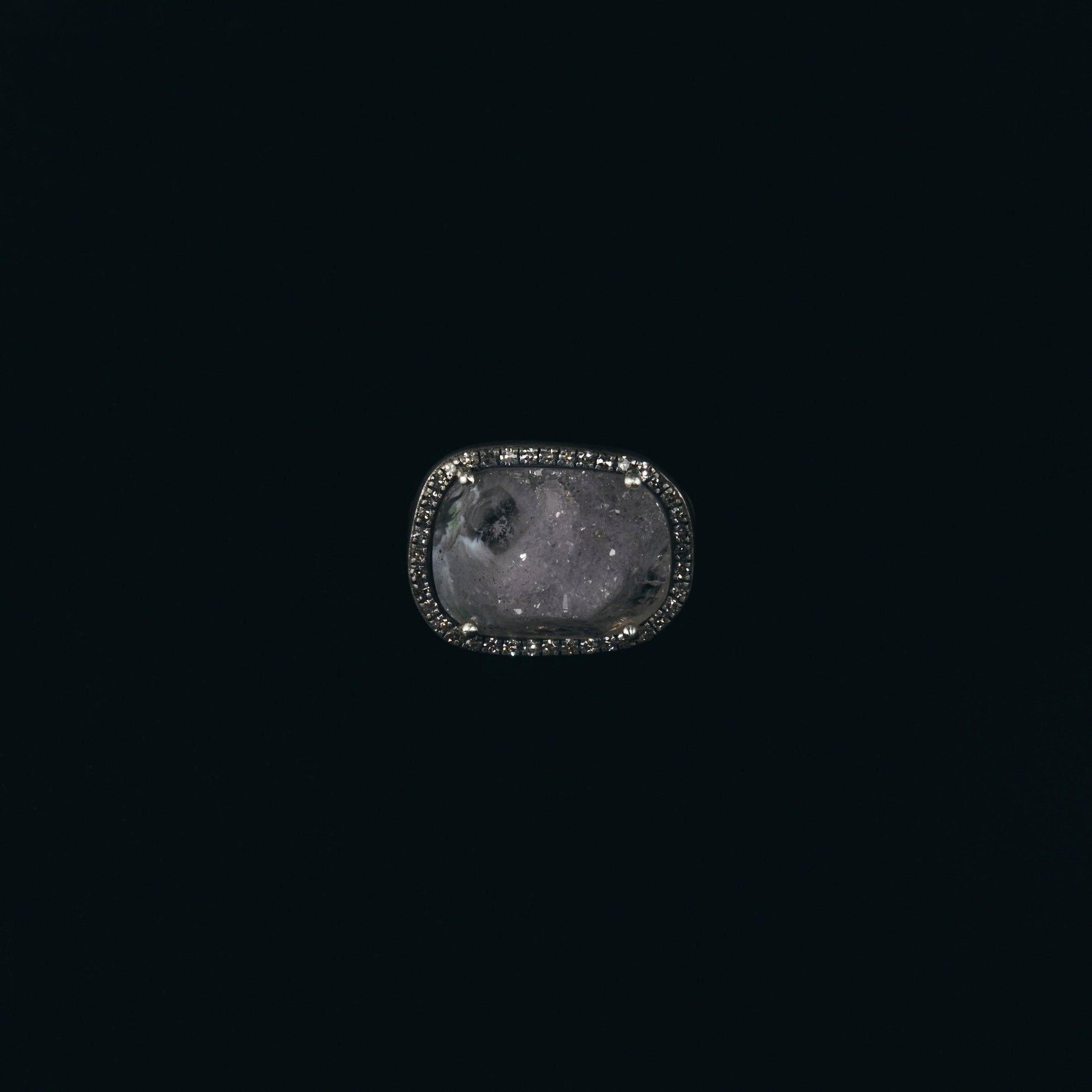 長年眠っていたデッドストックのストーンを、日本国内の職人の手によりモダンなカットに擦り上げました。パヴェダイヤモンドで取り巻き、爪部分にオキシダイズド加工をほどこすことでヴィンテージピースのような風合いに。丸みを帯びたボリュームシェイプのリングに成形しました。地金はリサイクルされたSilver925を使用、マットフィニッシュに柔らかな光沢を残しました。一点ものとなります。