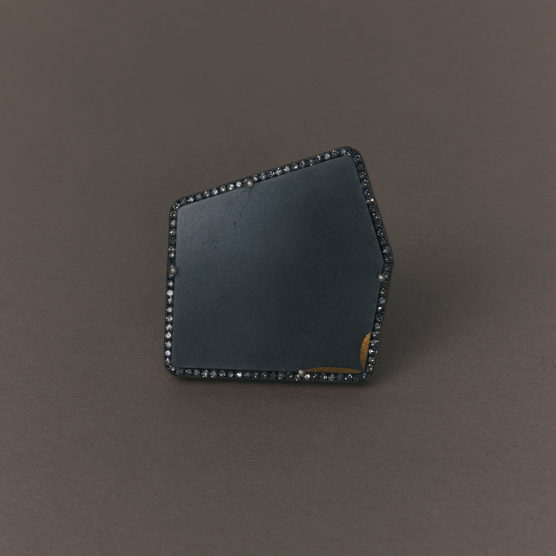 Adlin Hueは、その金彩の美しい欠片を小さくカットし、角を丁寧に磨き上げ、“ひとつの宝石”としてリングにセッティング。パヴェダイヤモンドで取り巻き、爪部分にオキシダイズド加工をほどこすことでヴィンテージピースのような風合いに。