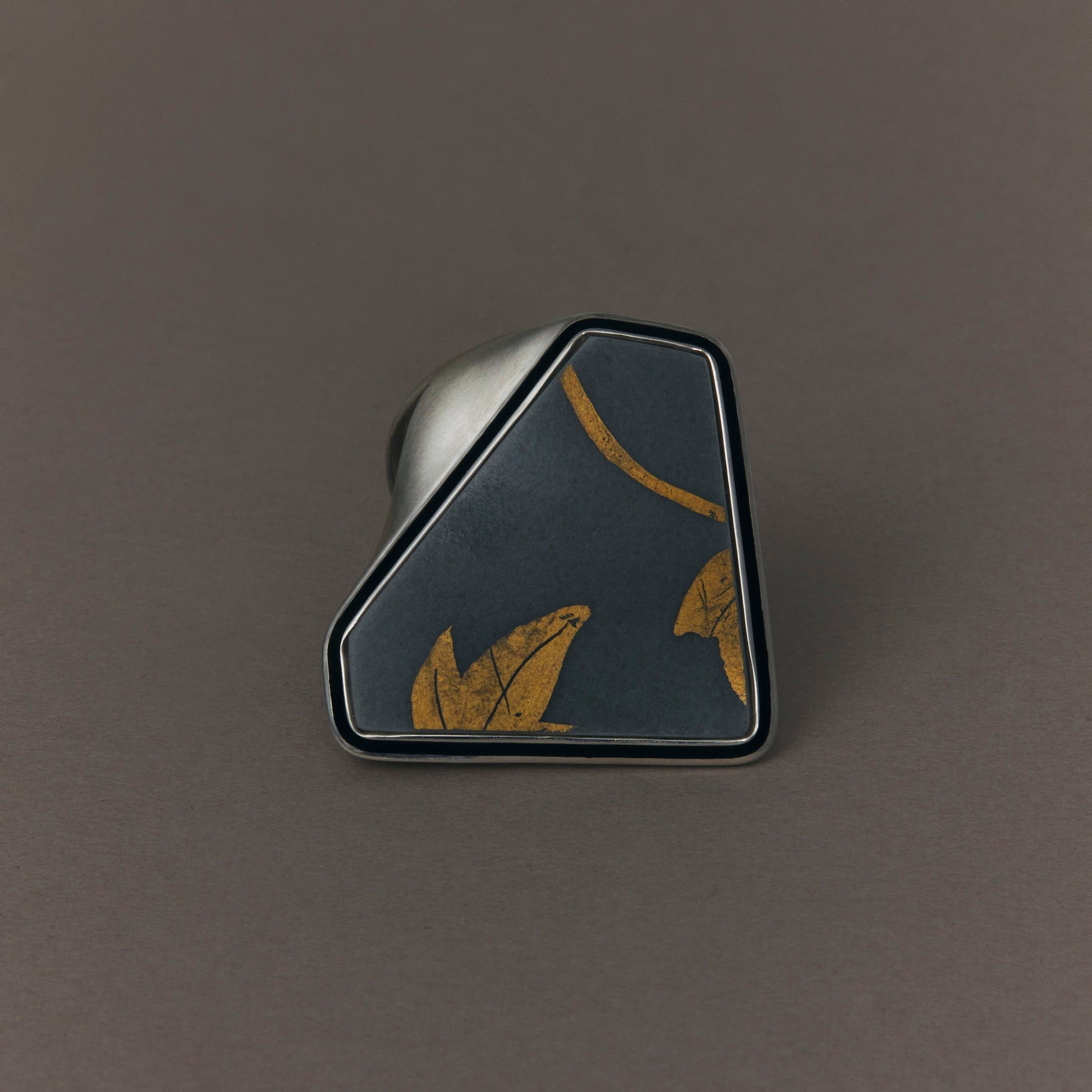 Adlin Hueは、その金彩の美しい欠片を小さくカットし、角を丁寧に磨き上げ、“ひとつの宝石”としてリングにセッティング。ストーンの周りにブラックのエナメルを流し込み、サイドを開けたシャープなラインのリングに成形しました。