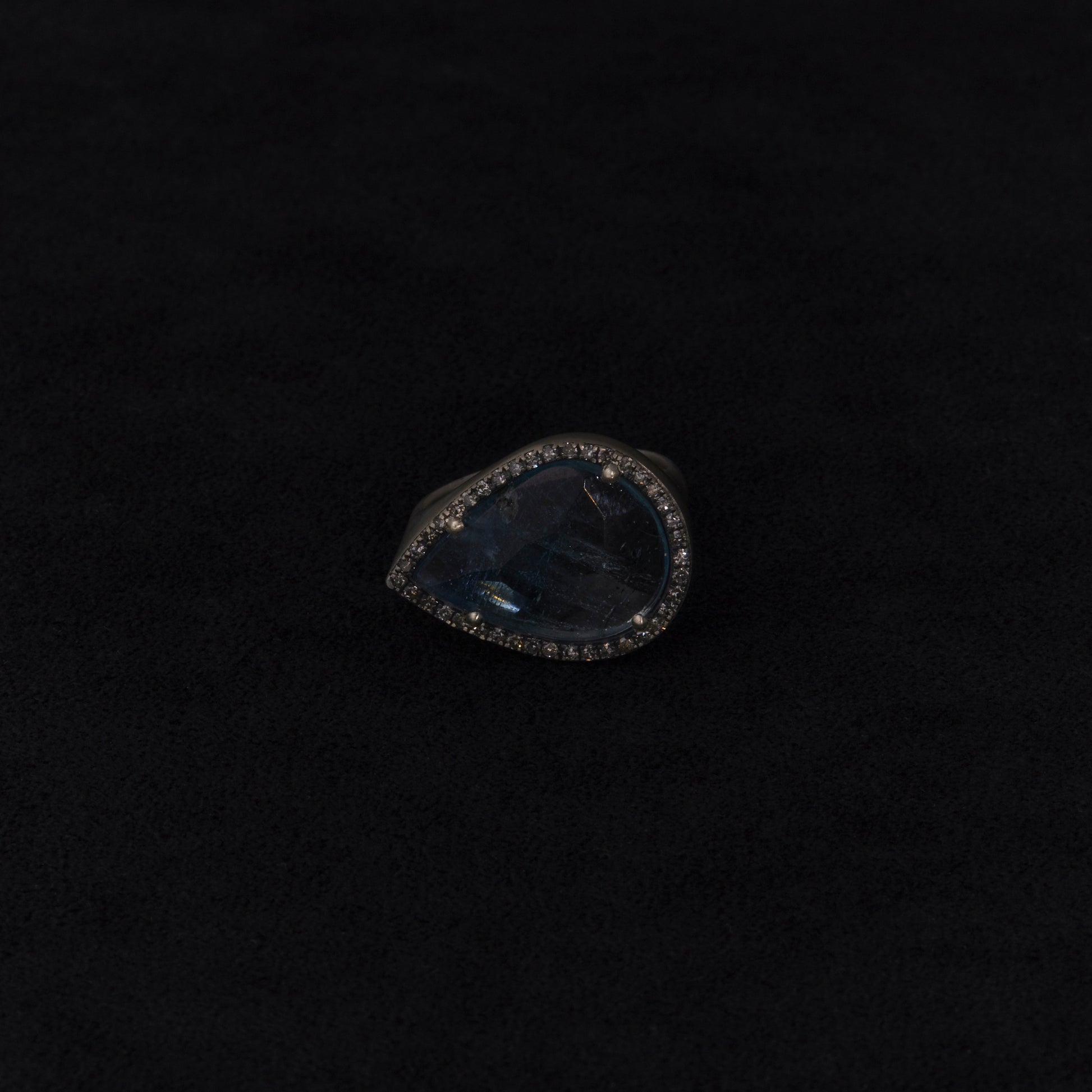 長年眠っていたデッドストックのストーンを、日本国内の職人の手によりモダンなカットに擦り上げました。パヴェダイヤモンドで取り巻き、爪部分にオキシダイズド加工をほどこすことでヴィンテージピースのような風合いに。丸みを帯びたボリュームシェイプのリングに成形しました。地金はリサイクルされたSilver925を使用、マットフィニッシュに柔らかな光沢を残しました。一点ものとなります。
