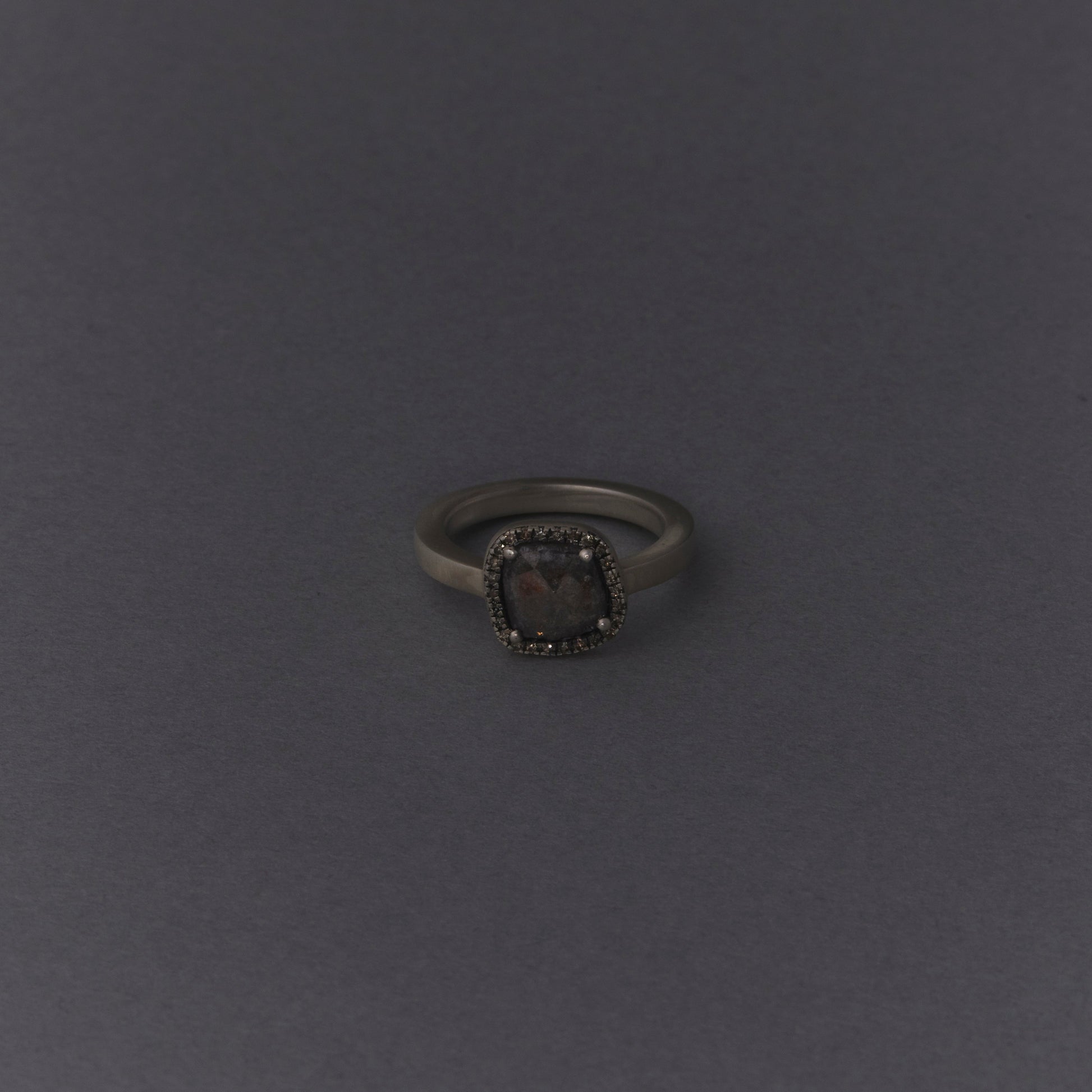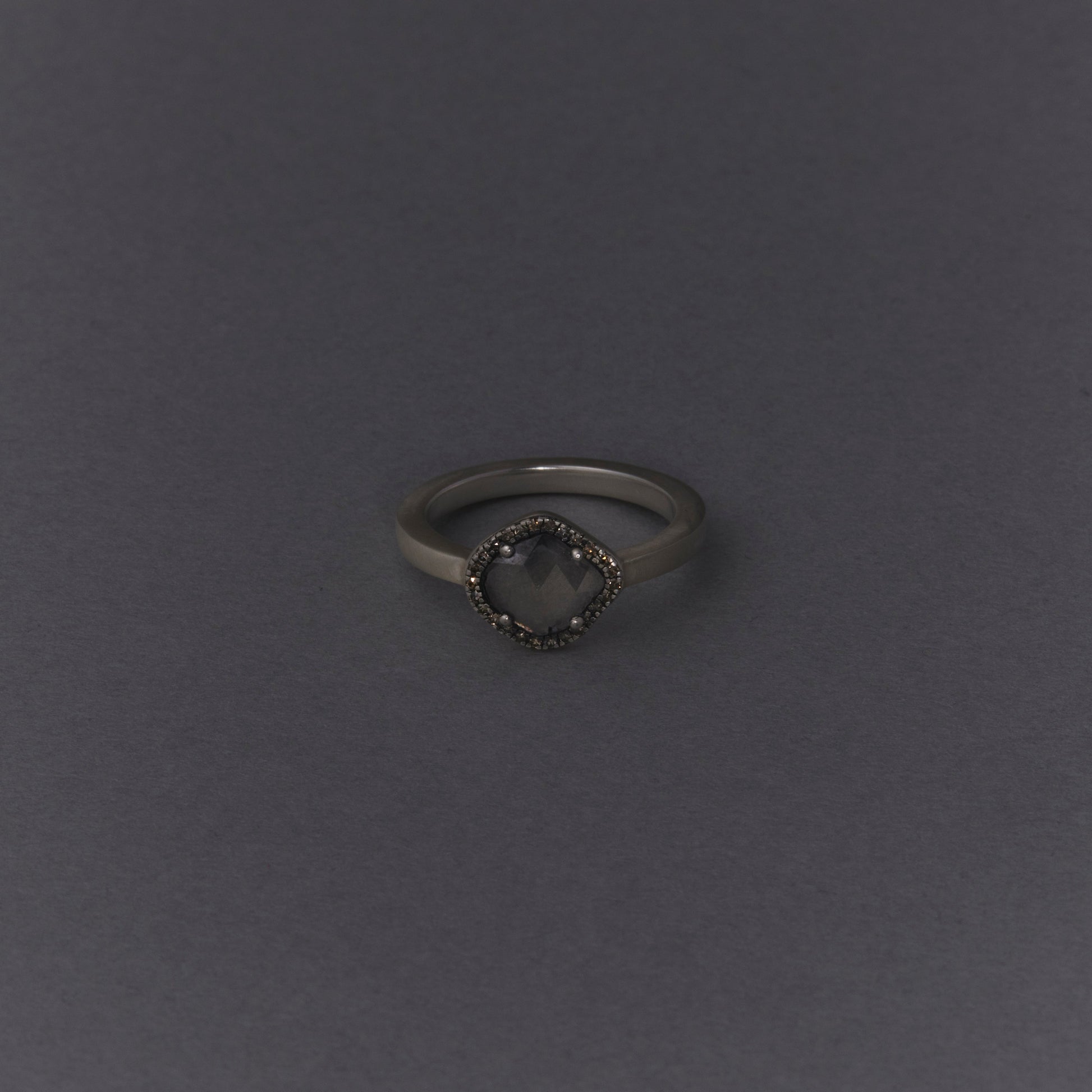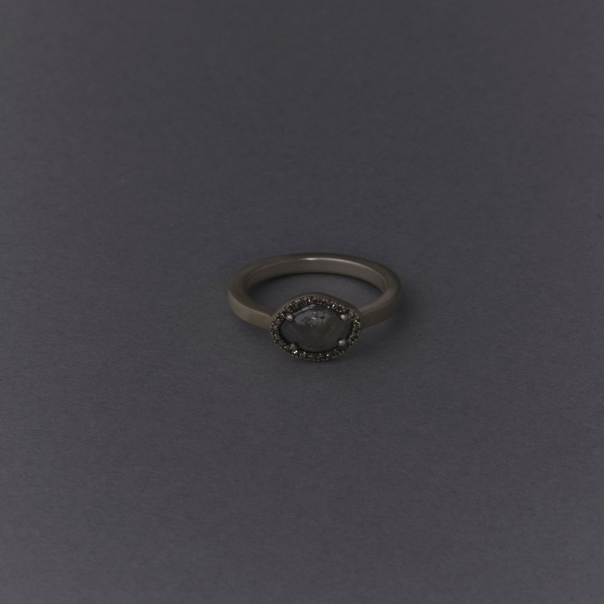 長年眠っていたデッドストックのストーンを、日本国内の職人の手によりモダンなカットに擦り上げました。パヴェのブラウンダイヤモンドで取り巻き、爪部分にオキシダイズド加工をほどこすことでヴィンテージピースのような風合いに。シャープな角線のリングに成形しました。地金はリサイクルされたSilver925を使用、マットフィニッシュに柔らかな光沢を残しました。一点ものとなります。