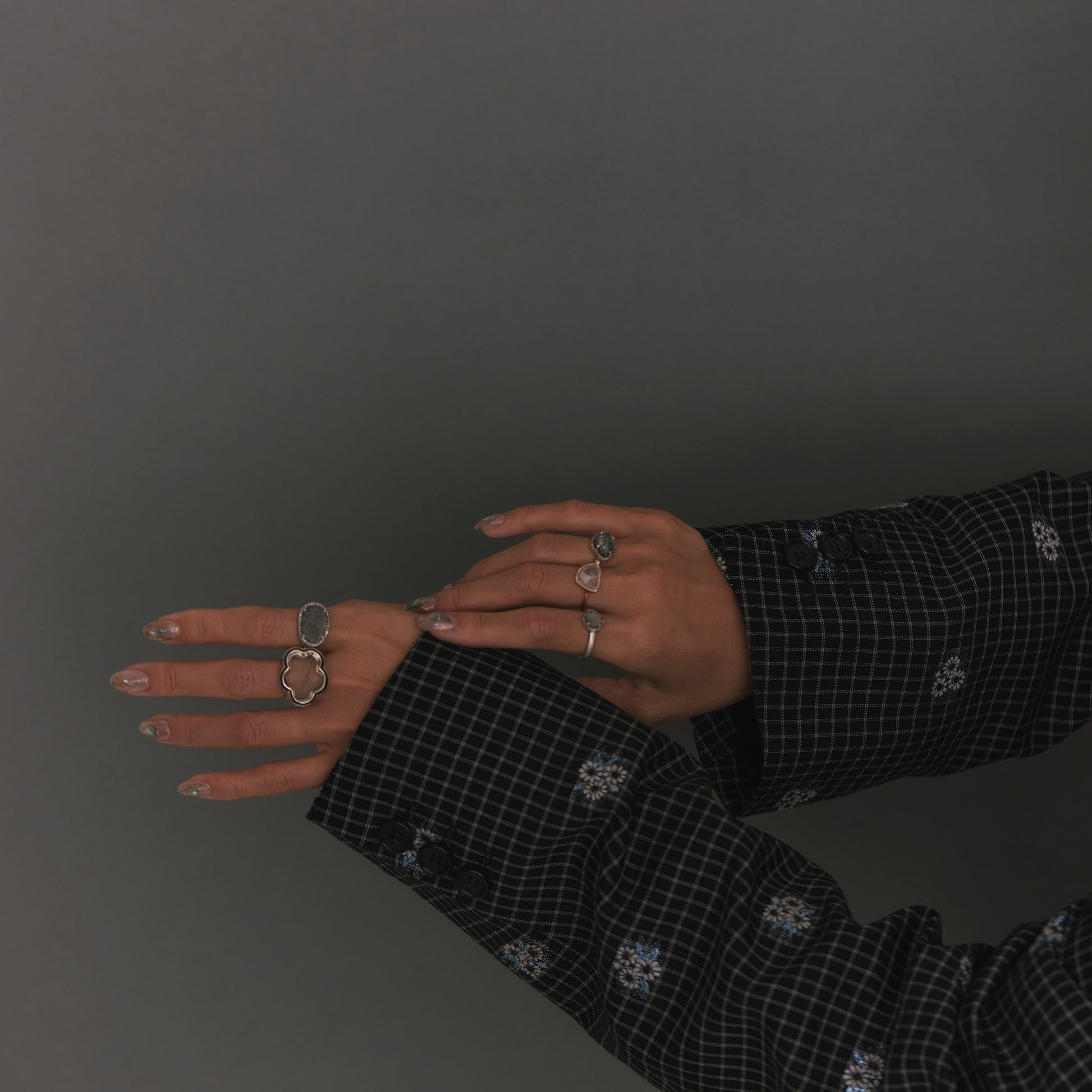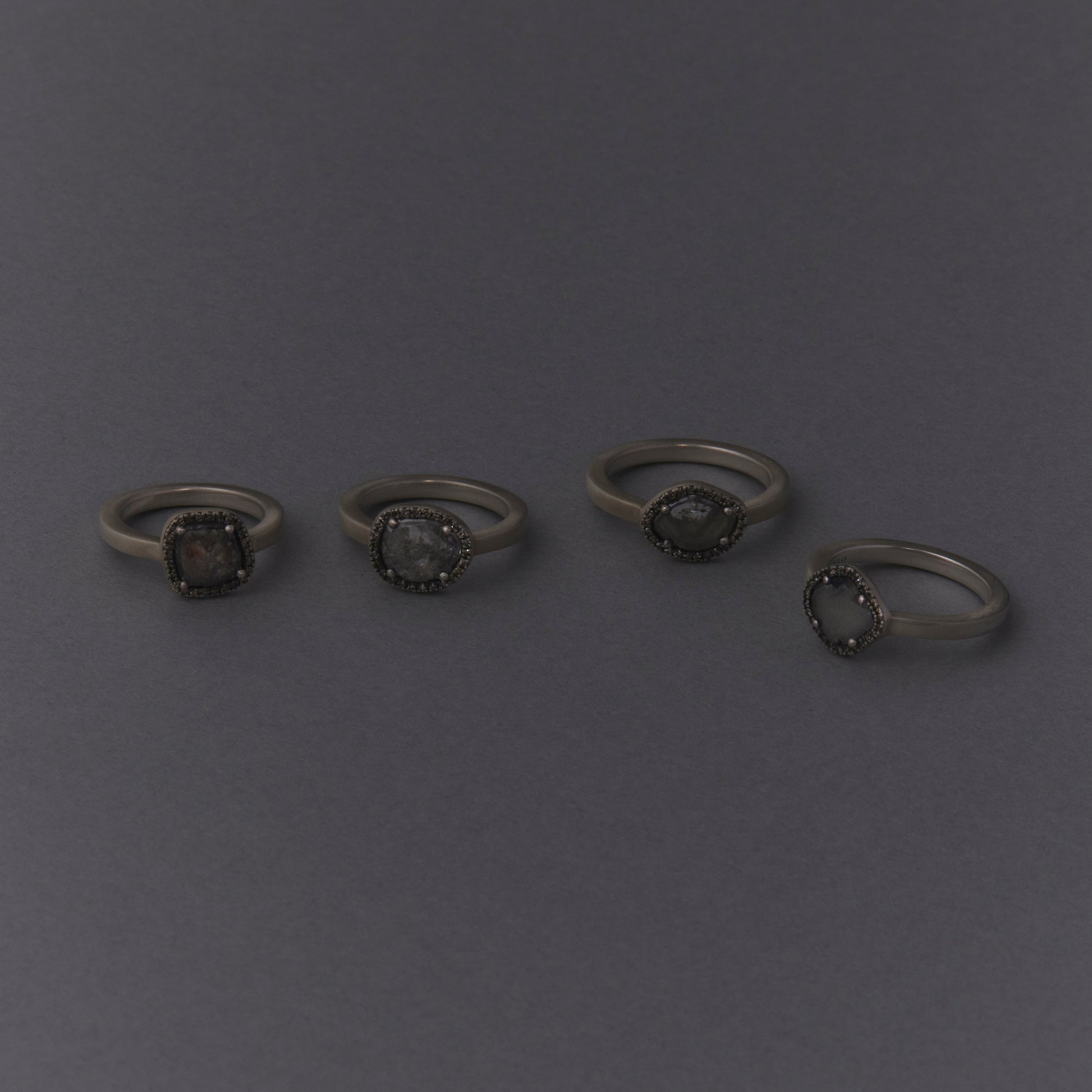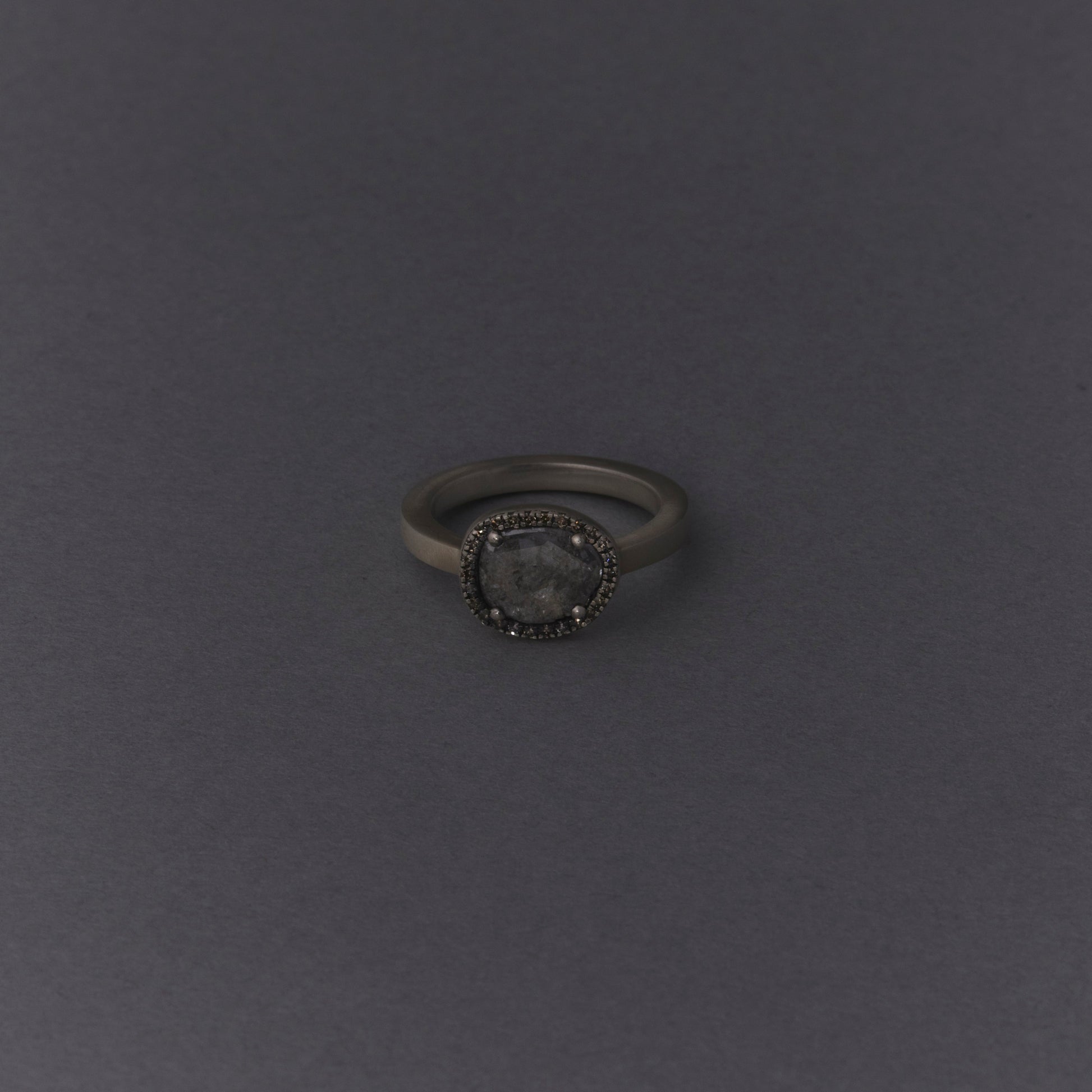 長年眠っていたデッドストックのストーンを、日本国内の職人の手によりモダンなカットに擦り上げました。パヴェのブラウンダイヤモンドで取り巻き、爪部分にオキシダイズド加工をほどこすことでヴィンテージピースのような風合いに。シャープな角線のリングに成形しました。地金はリサイクルされたSilver925を使用、マットフィニッシュに柔らかな光沢を残しました。一点ものとなります。