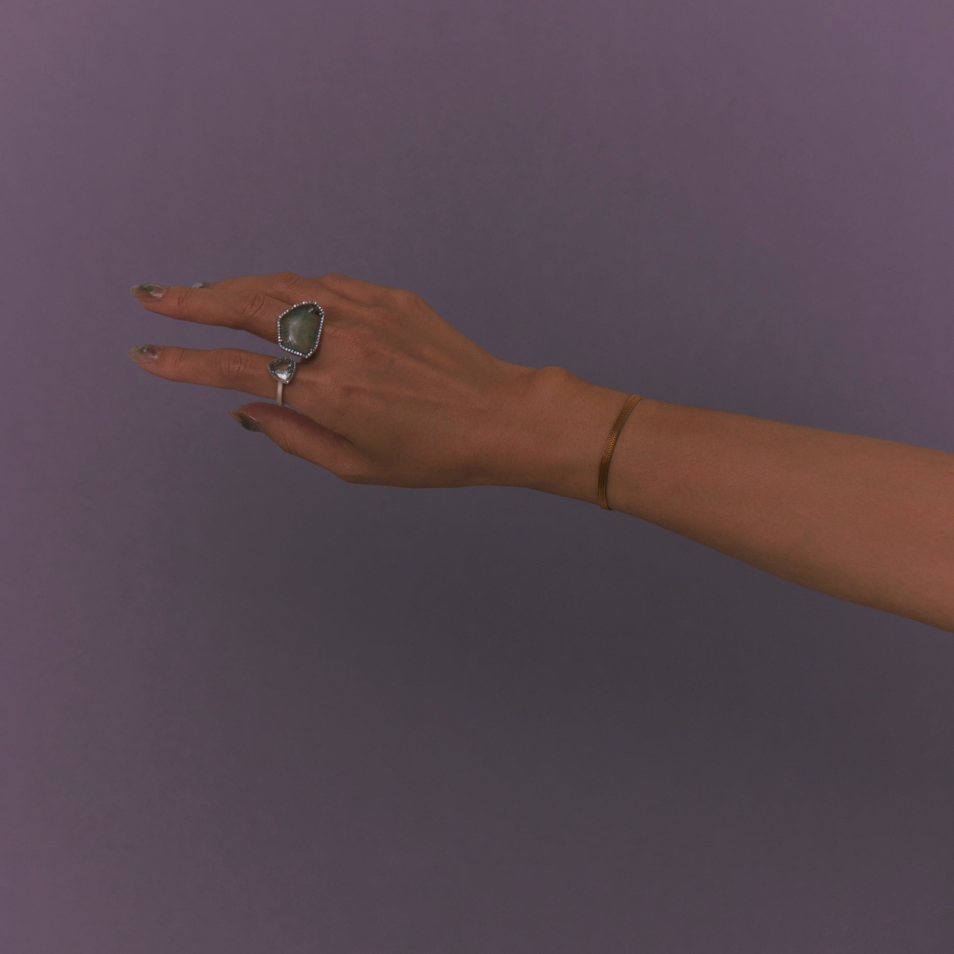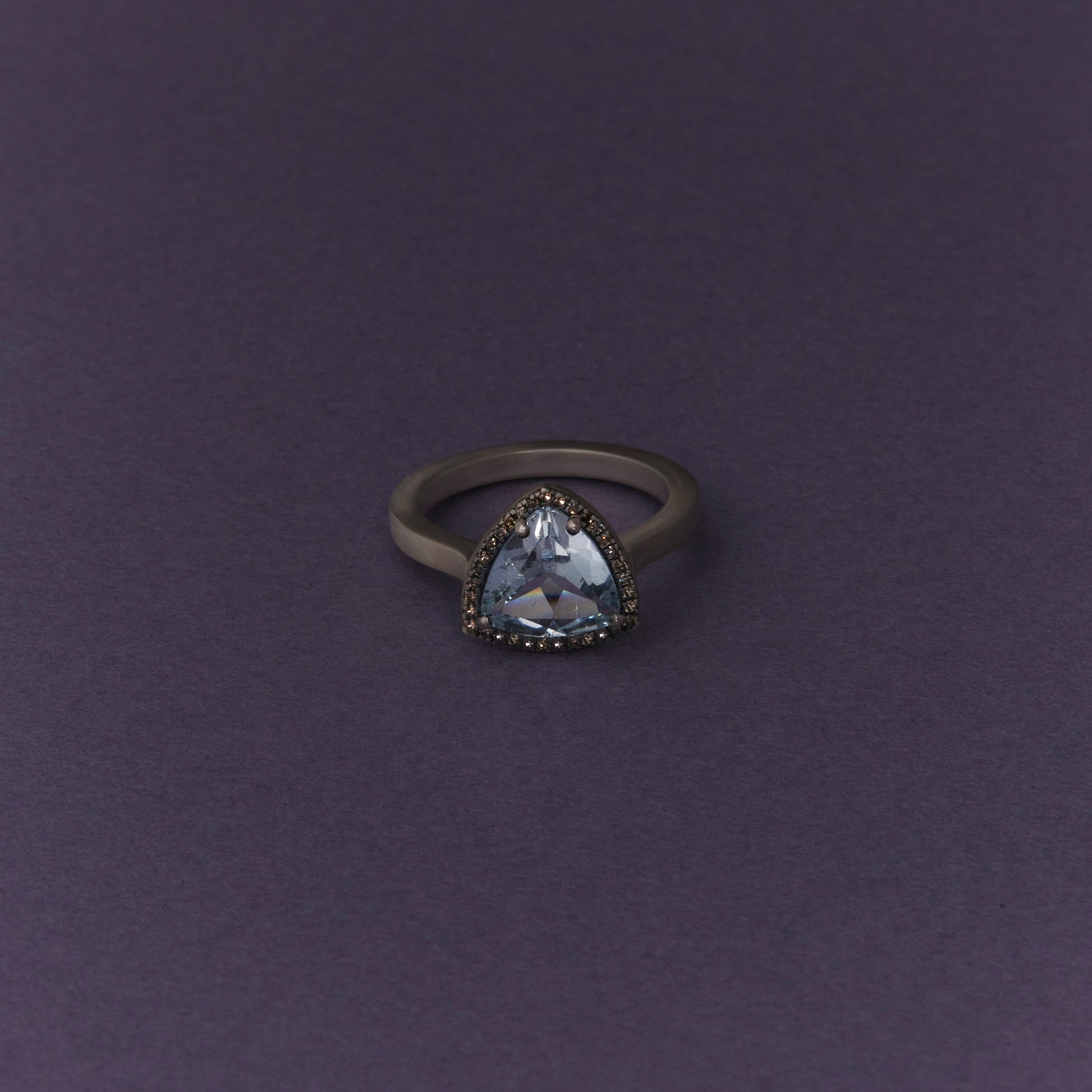 長年眠っていたデッドストックのストーンを、日本国内の職人の手によりモダンなカットに擦り上げました。パヴェのブラウンダイヤモンドで取り巻き、爪部分にオキシダイズド加工をほどこすことでヴィンテージピースのような風合いに。シャープな角線のリングに成形しました。地金はリサイクルされたSilver925を使用、マットフィニッシュに柔らかな光沢を残しました。一点ものとなります。
