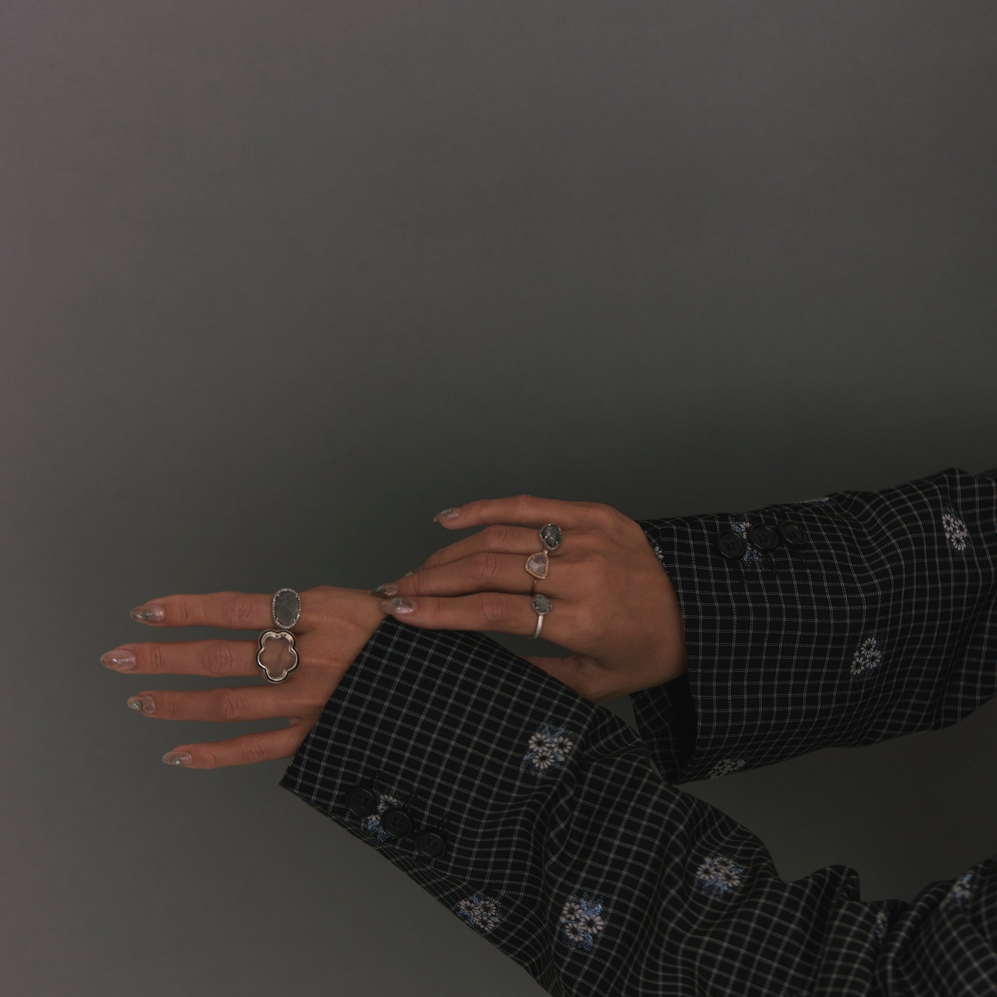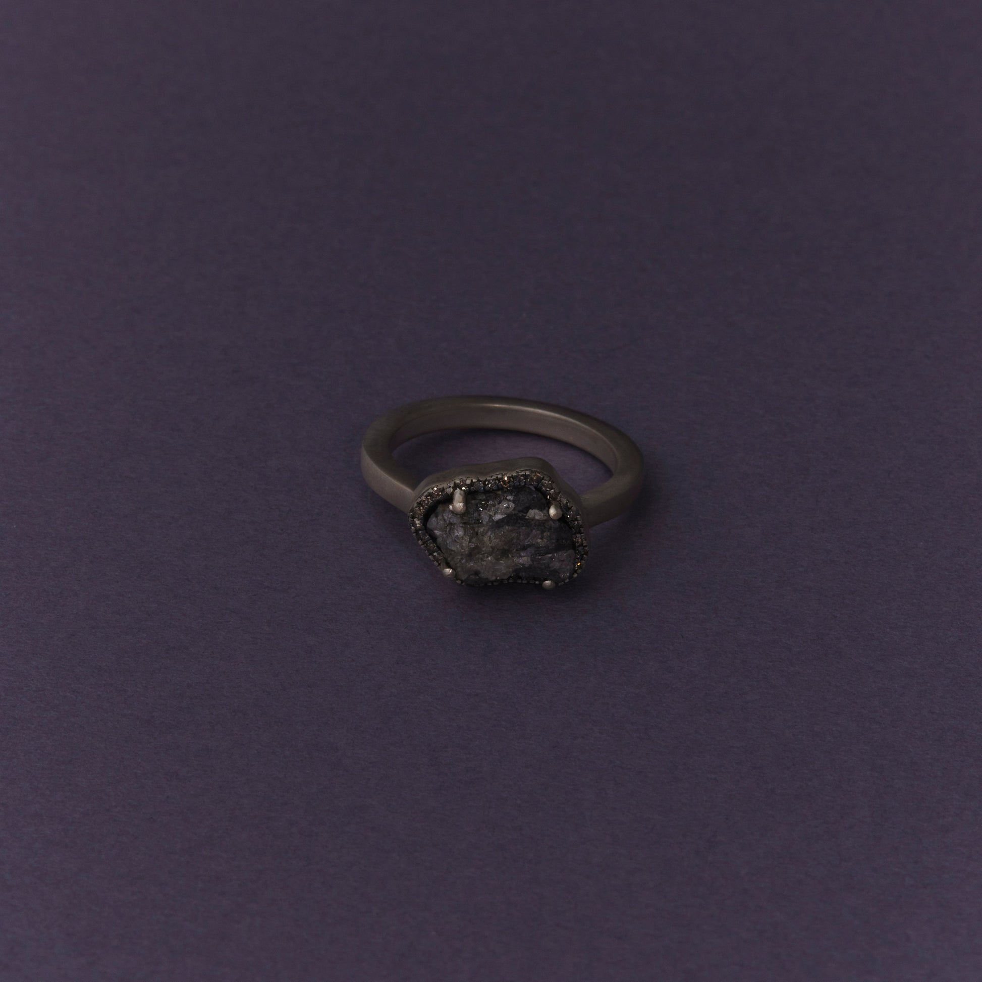 長年眠っていたデッドストックのストーンを、日本国内の職人の手によりモダンなカットに擦り上げました。パヴェのブラウンダイヤモンドで取り巻き、爪部分にオキシダイズド加工をほどこすことでヴィンテージピースのような風合いに。シャープな角線のリングに成形しました。地金はリサイクルされたSilver925を使用、マットフィニッシュに柔らかな光沢を残しました。一点ものとなります。