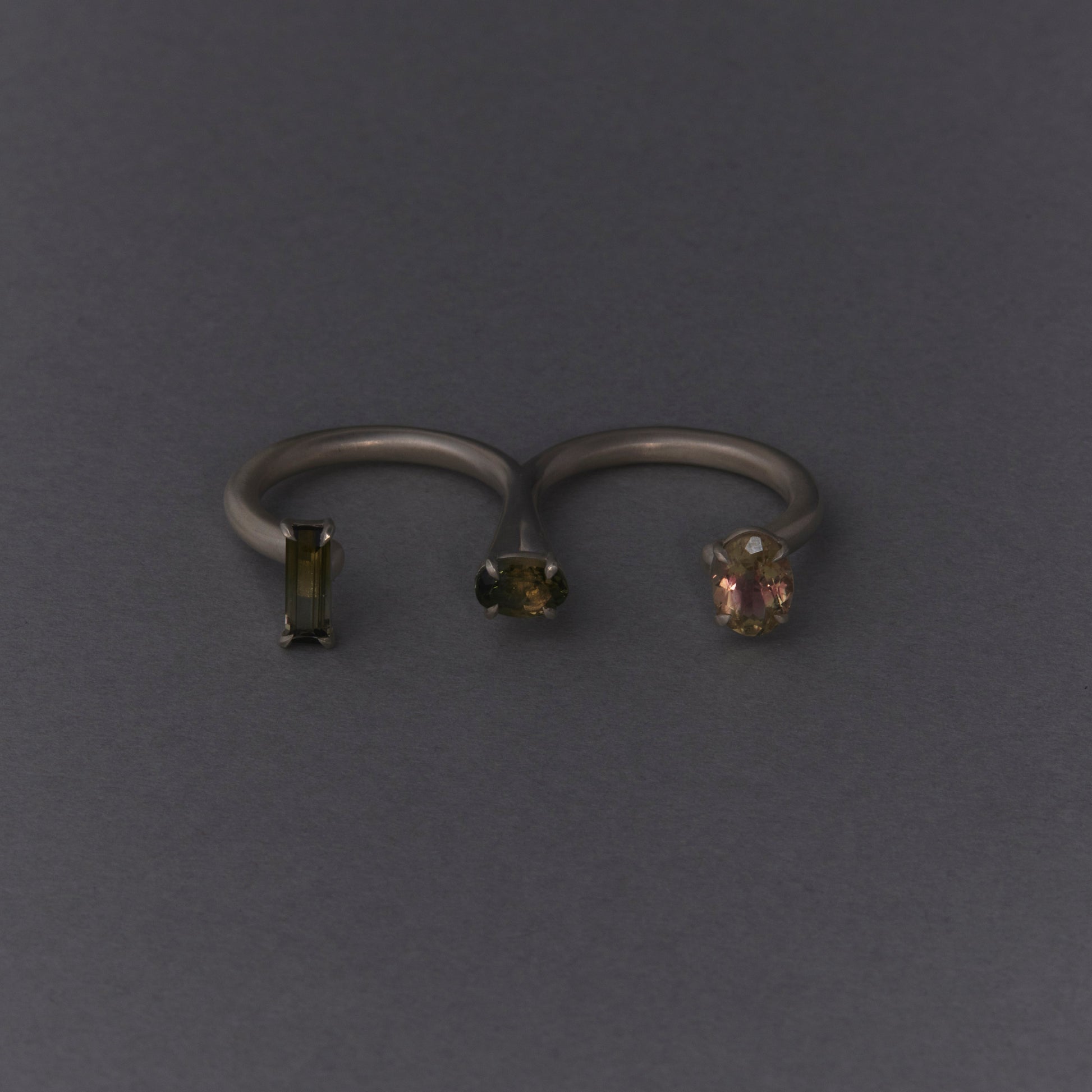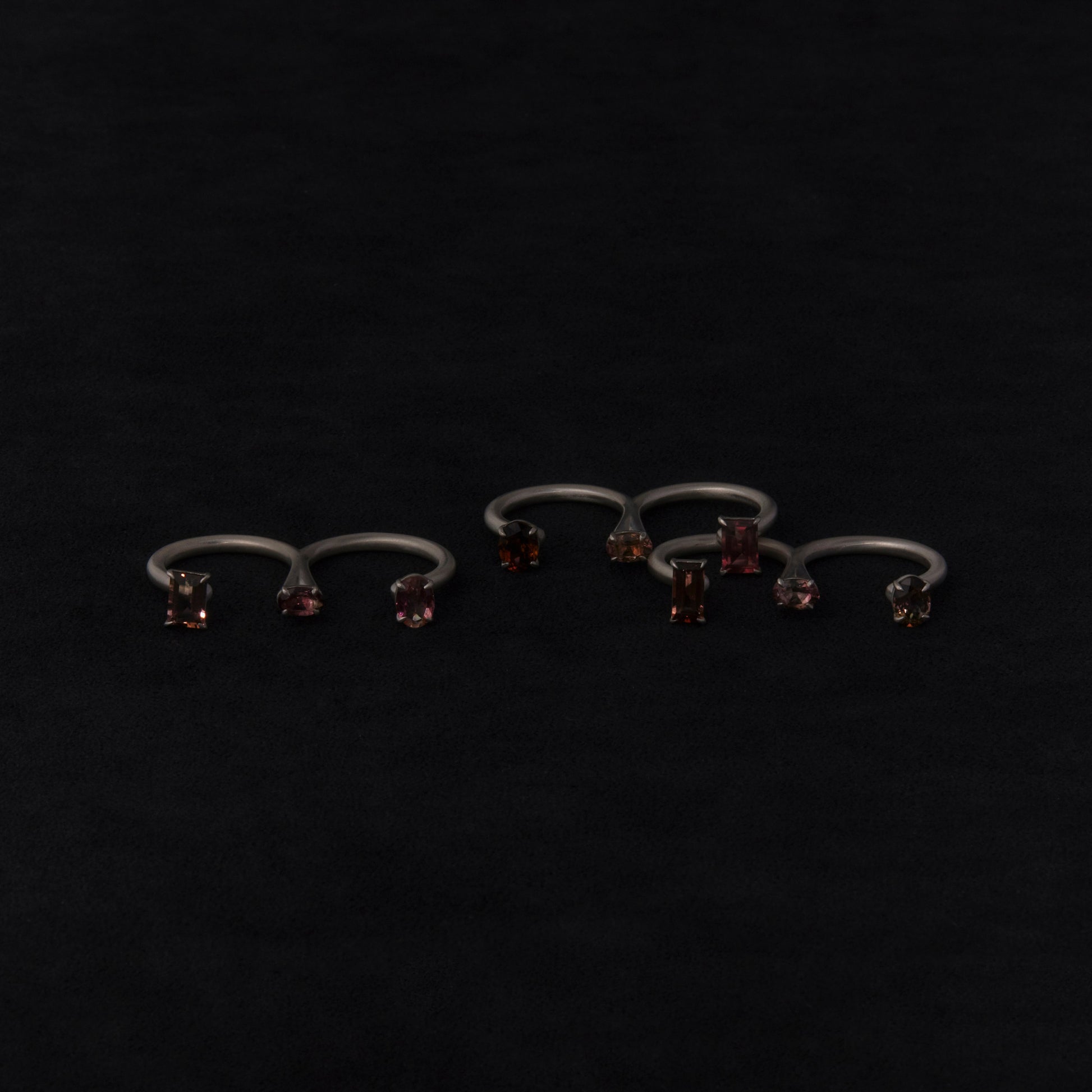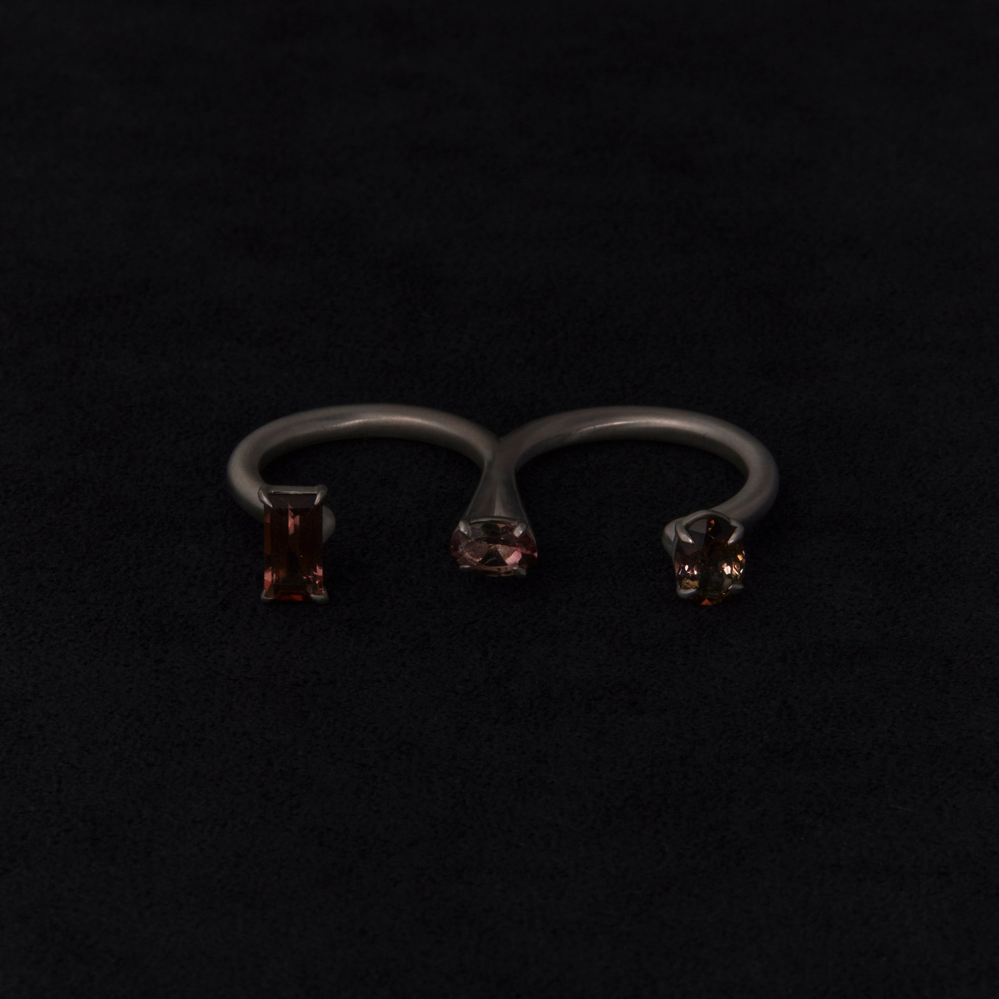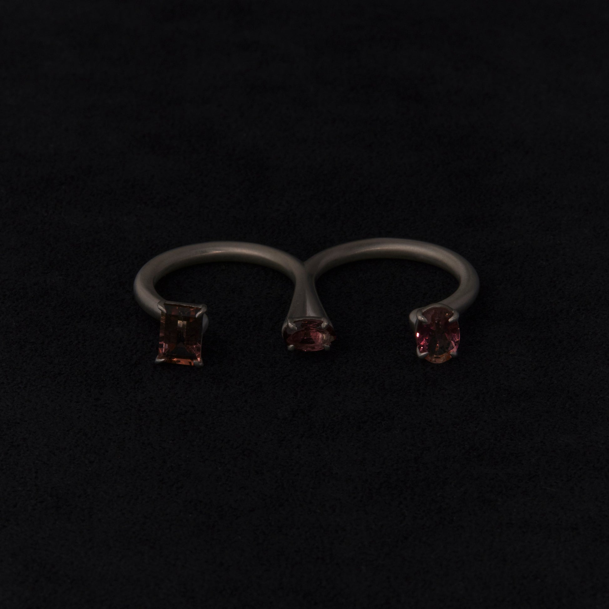 長年眠っていたデッドストックのストーンを使用しています。オーバルとレクタングルのピンクトルマリンを配したダブルフィンガーリング。地金はリサイクルされたSilver925を使用、マットフィニッシュに柔らかな光沢を残しました。