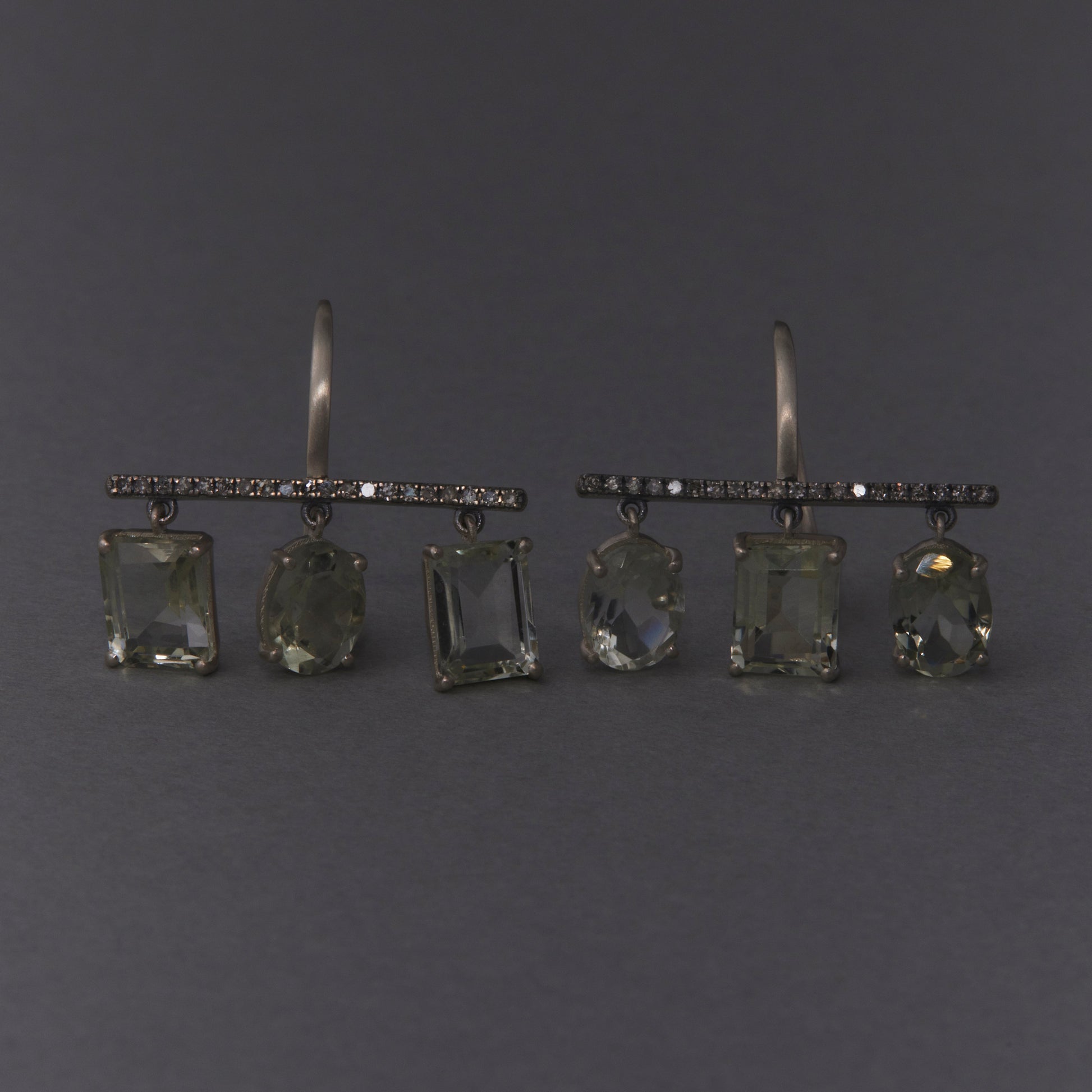 オーバルとレクタングルのグリーンアメシストをランダムに連ねています。 地金はリサイクルされたSilver925を使用、繊細なバーにパヴェダイヤモンドを配し、爪部分にオキシダイズド加工をほどこすことでヴィンテージピースのような風合いに。