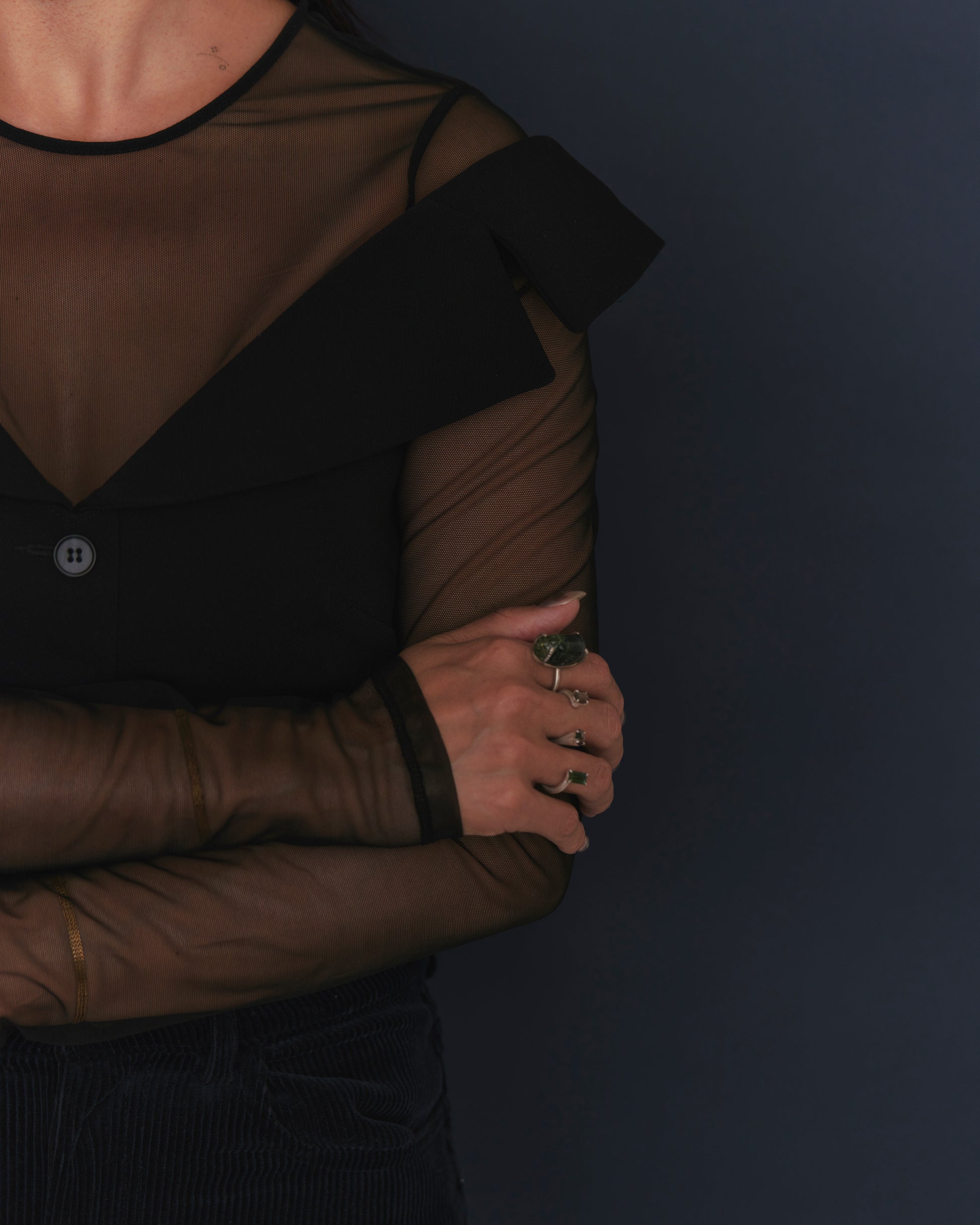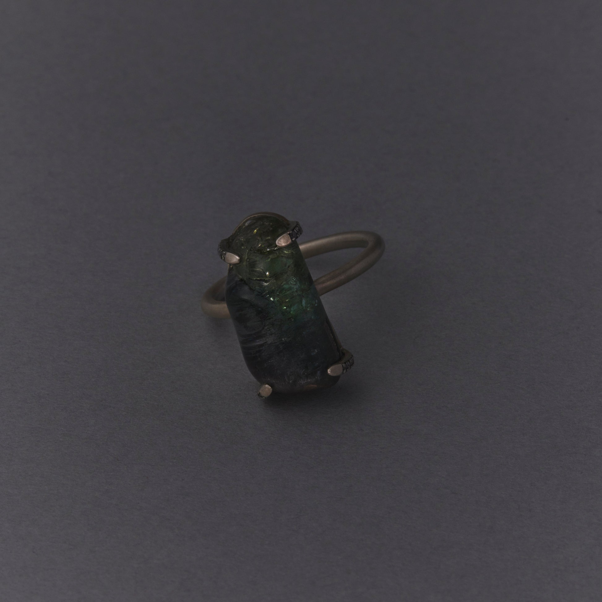 長年眠っていたデッドストックのストーンを、日本国内の職人の手によりモダンなカットに擦り上げました。パヴェダイヤモンドで取り巻き、爪部分にオキシダイズド加工をほどこすことでヴィンテージピースのような風合いに。ボリュームのあるワイドバンドリングに成形しました。地金はリサイクルされたSilver925を使用、マットフィニッシュに柔らかな光沢を残しました。一点ものとなります。