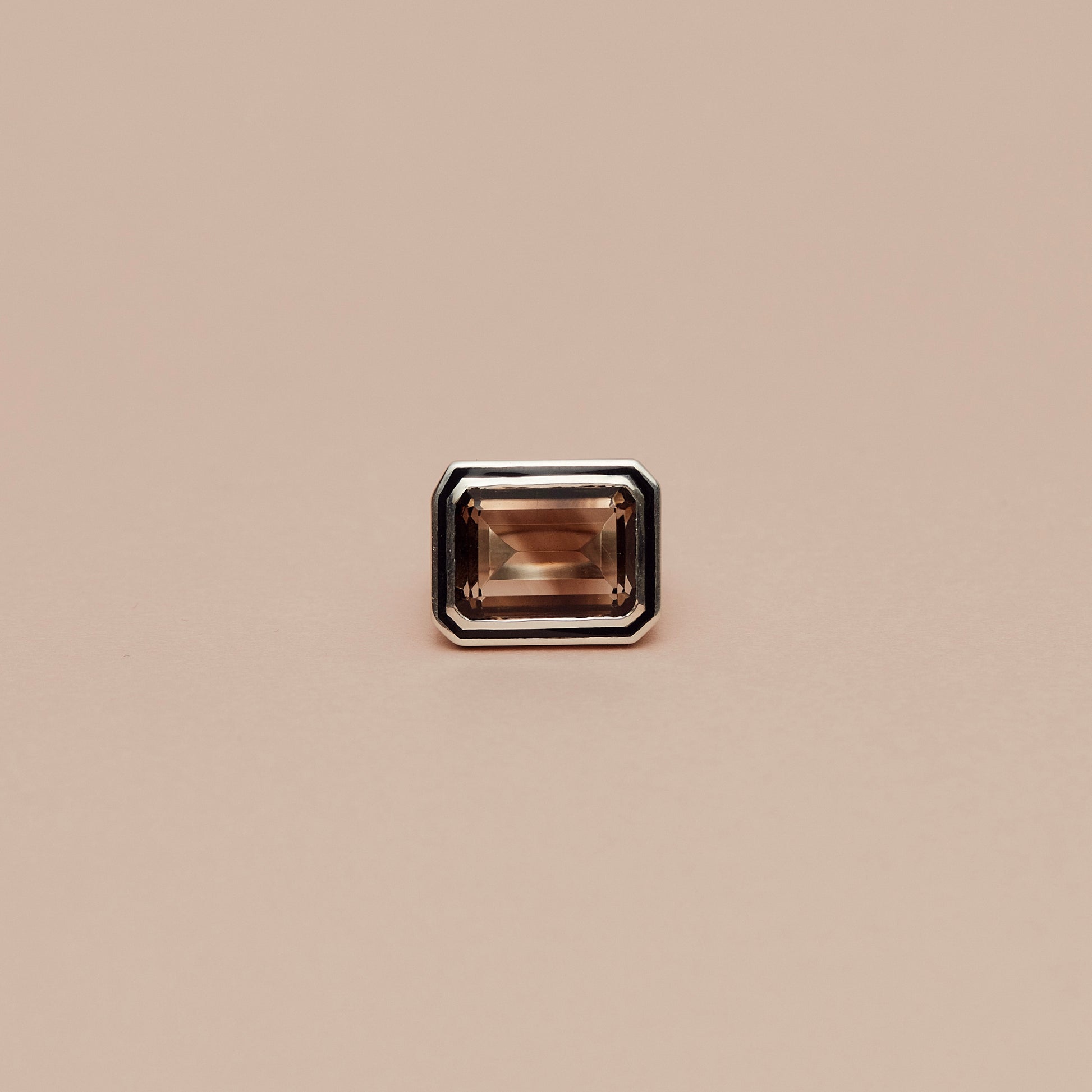 ストーン | スモーキークォーツ その石は、身体と大地のエネルギーを繋ぐ。争いに勝ち、種族を維持する。 ストーン+枠サイズ:16mm × 20mm リング幅:3mm
