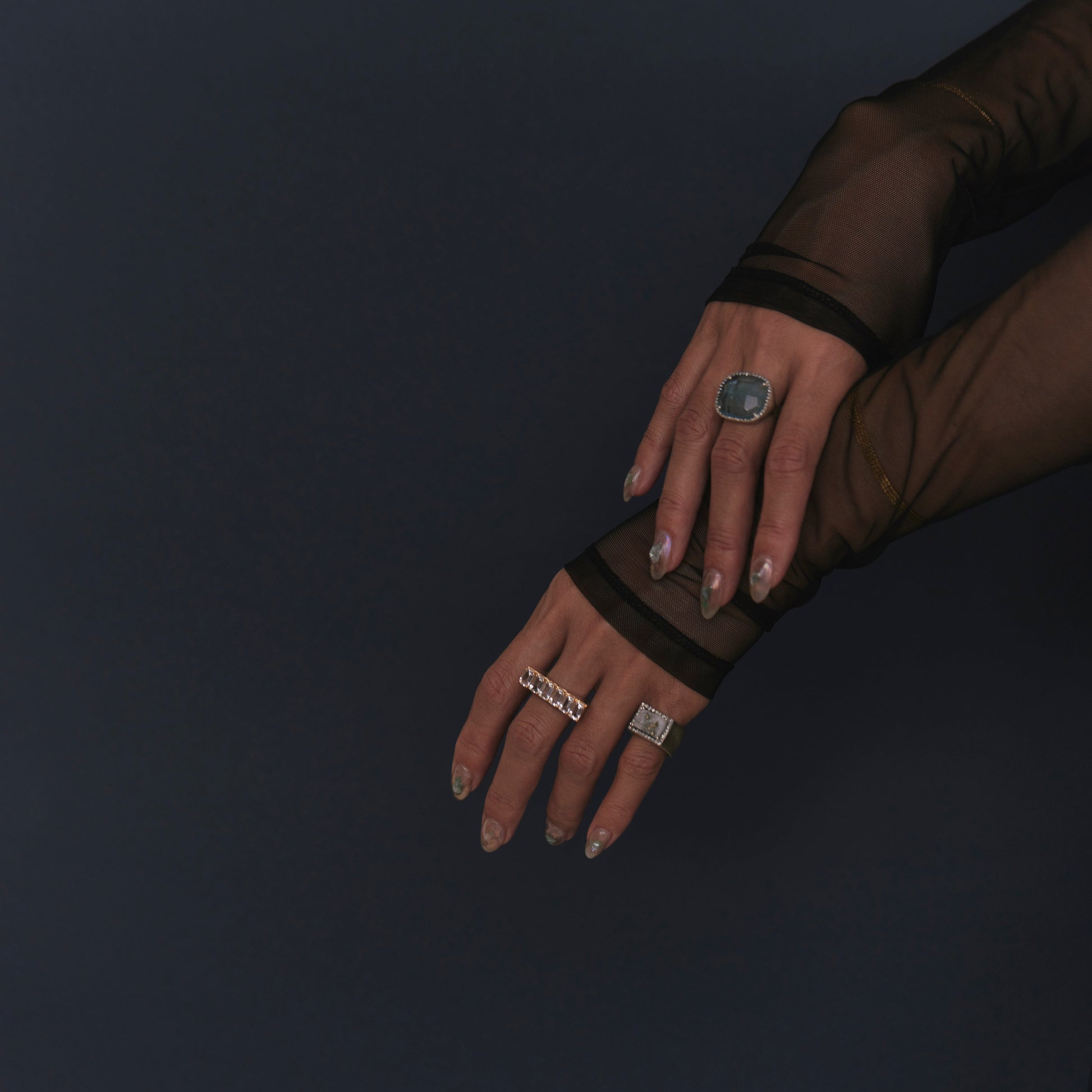 長年眠っていたデッドストックのストーンを使用しています。エメラルドカットのホワイトトパーズを6石K18YGの爪で留め、枠部分もK18YGで仕上げました。ベースの地金はリサイクルされたSilver925を使用、サイドをオープンに軽く仕上げ、マットフィニッシュに柔らかな光沢を残しました。