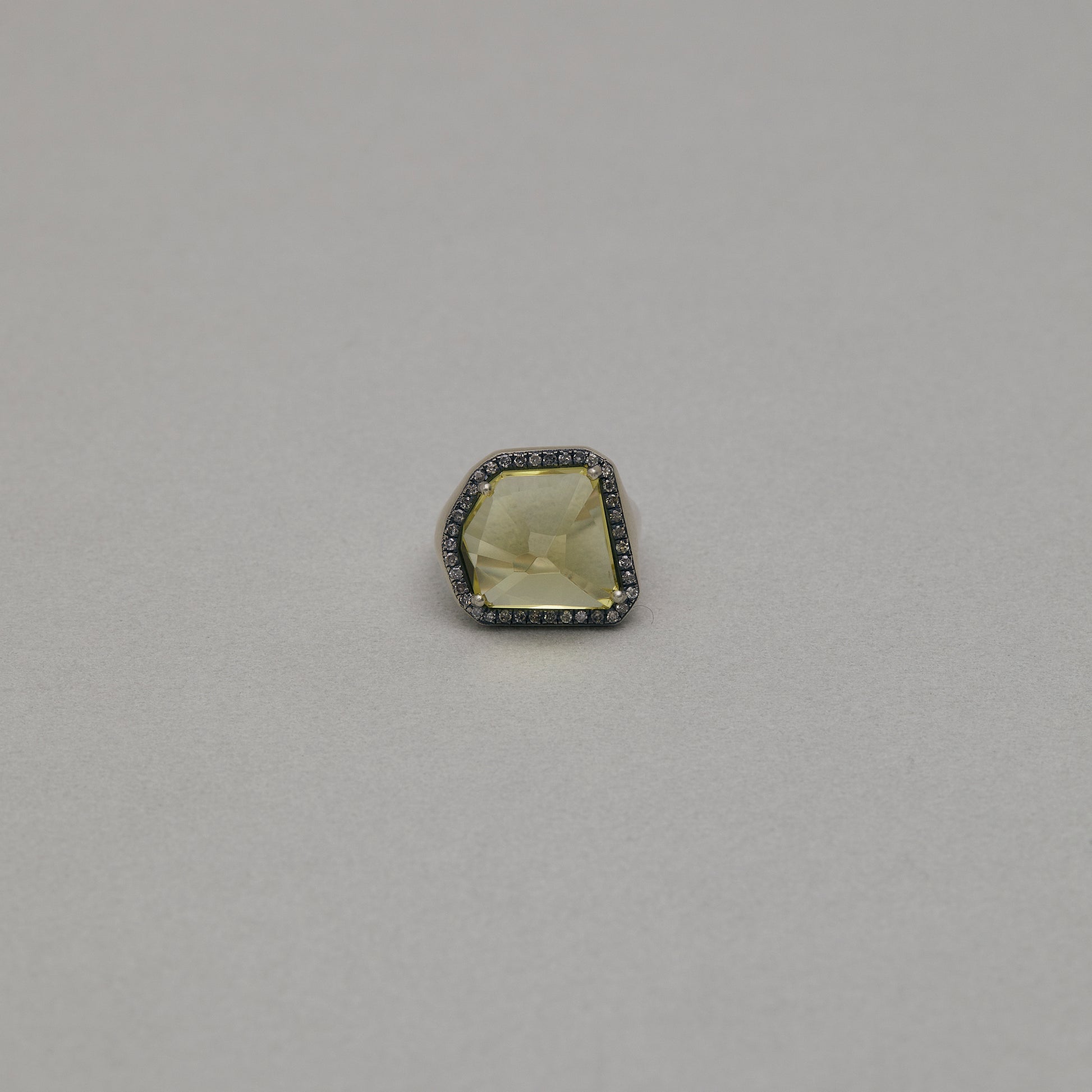 長年眠っていたデッドストックのストーンを、日本国内の職人の手によりモダンなカットに擦り上げました。パヴェダイヤモンドで取り巻き、爪部分にオキシダイズド加工をほどこすことでヴィンテージピースのような風合いに。ボリュームのあるワイドバンドリングに成形しました。地金はリサイクルされたSilver925を使用、マットフィニッシュに柔らかな光沢を残しました。一点ものとなります。