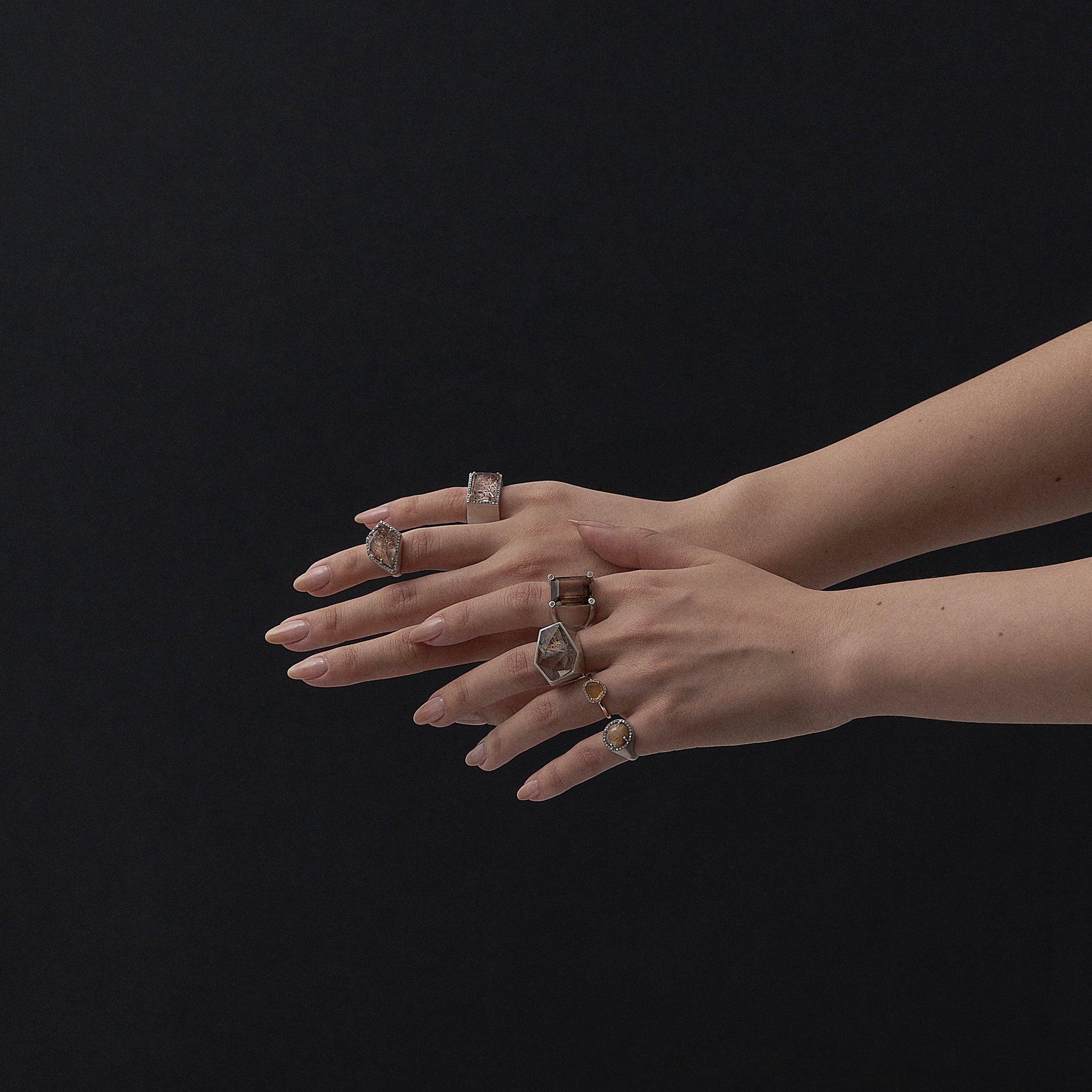 長年眠っていたデッドストックのストーンを、日本国内の職人の手によりモダンなカットに擦り上げました。曲線を描く4本のアームの先に大粒のダイヤモンドを添えたリング。 地金はリサイクルされたSilver925を使用、マットフィニッシュに柔らかな光沢を残しました。一点ものとなります。